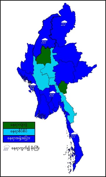 မနက်ဖြန်နံနက်အထိခန့်မှန်းချက်။ စစ်ကိုင်းတိုင်းဒေသကြီးအောက်ပိုင်းနှင့် ကယားပြည်နယ်တို့တွင် နေရာကျဲကျဲ၊ နေပြည်တော်၊ မန္တလေးတိုင်းဒေသကြီး၊ မကွေးတိုင်းဒေသကြီးနှင့် ကရင်ပြည်နယ်တို့တွင် နေရာစိပ်စိပ်နှင့် ကျန်တိုင်းဒေသကြီးနှင့် ပြည်နယ်တို့တွင် နေရာအနှံ့အပြား မိုးထစ်ချုန်းရွာပြီး၊ ပဲခူးတိုင်းဒေသကြီး၊ စစ်ကိုင်းတိုင်းဒေသကြီးအထက်ပိုင်း၊ တနင်္သာရီတိုင်းဒေသကြီး၊ ကချင်ပြည်နယ်နှင့် ရခိုင်ပြည်နယ်တို့တွင် နေရာကွက်၍ မိုးကြီးနိုင်ပါသည်။ ရွာရန်ရာနှုန်းပြည့် ဖြစ်ပါသည်။