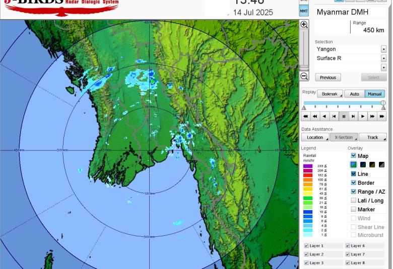မိုးတိမ်တောင်ဖြစ်ပေါ်မှုအခြေအနေ။ ရန်ကုန်တိုင်းဒေသကြီး၊ ပဲခူးတိုင်းဒေသကြီး၊ မကွေးတိုင်းဒေသကြီး၊ စစ်ကိုင်းတိုင်းဒေသကြီးအထက်ပိုင်း၊ တနင်္သာရီတိုင်းဒေသကြီး၊ ကချင်ပြည်နယ်၊ ချင်းပြည်နယ်၊ ရခိုင်ပြည်နယ်နှင့် ရှမ်းပြည်နယ်(မြောက်ပိုင်းနှင့် တောင်ပိုင်း)တို့တွင် မိုးတိမ်တောင်များ ဖြစ်ထွန်းလျက်ရှိပြီး၊ အဆိုပါ မိုးတိမ်တောင်များ ရွေ့လျားရာနေရာ တစ်လျှောက်တွင် မိုးရွာသွန်းခြင်းနှင့်အတူ လေပြင်းတိုက်ခတ်ခြင်း၊ မိုးထစ်ချုန်းခြင်း၊ မိုးကြိုးပစ်ခြင်း၊ လျှပ်စီးလက်ခြင်းနှင့် မိုးသီးကြွေခြင်းစသည့် မိုးလေဝသဖြစ်စဉ်များ ဖြစ်ပေါ်နိုင်ပါသဖြင့် ကြိုတင်သတိပြုနိုင်ပါရန် အကြံပြုအပ်ပါသည်။