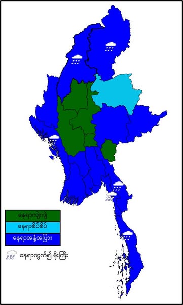 မနက်ဖြန်နံနက်အထိခန့်မှန်းချက်။ နေပြည်တော်၊ မန္တလေးတိုင်းဒေသကြီး၊ မကွေးတိုင်းဒေသကြီး၊ စစ်ကိုင်းတိုင်းဒေသကြီးအောက်ပိုင်းနှင့် ကယားပြည်နယ်တို့တွင် နေရာကျဲကျဲ၊ ရှမ်းပြည်နယ်(တောင်ပိုင်း)တွင် နေရာစိပ်စိပ်နှင့် ကျန်တိုင်းဒေသကြီးနှင့် ပြည်နယ်တို့တွင် နေရာအနှံ့အပြား မိုးထစ်ချုန်းရွာပြီး၊ စစ်ကိုင်းတိုင်းဒေသကြီးအထက်ပိုင်း၊ တနင်္သာရီတိုင်းဒေသကြီး၊ ကချင်ပြည်နယ်၊ ကရင်ပြည်နယ်၊ မွန်ပြည်နယ်နှင့် ရခိုင်ပြည်နယ်တို့တွင် နေရာကွက်၍ မိုးကြီးနိုင်ပါသည်။ ရွာရန်ရာနှုန်းပြည့် ဖြစ်ပါသည်။