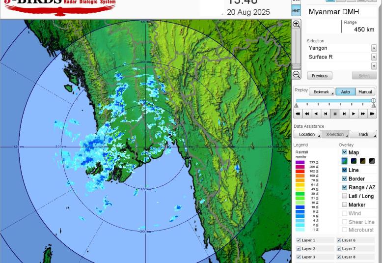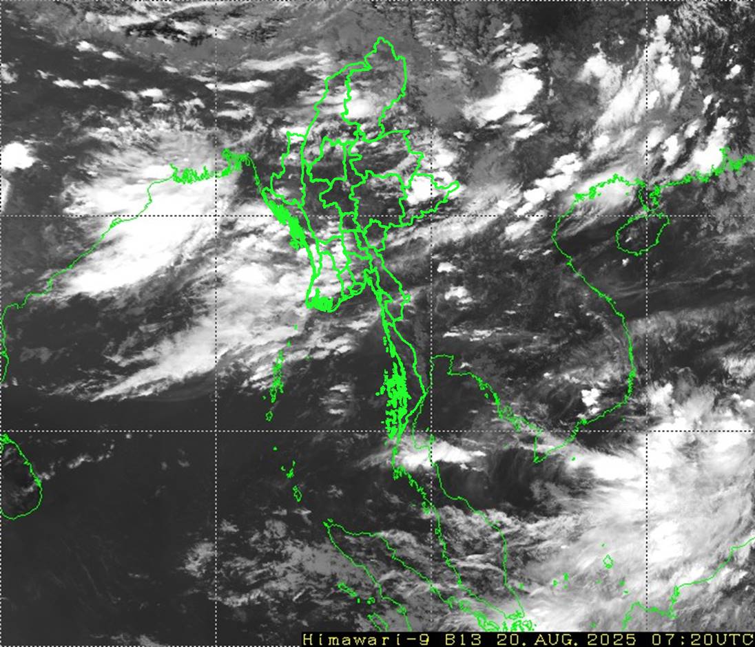 မိုးတိမ်တောင်ဖြစ်ပေါ်မှုအခြေအနေ။ ရန်ကုန်တိုင်းဒေသကြီး၊ ပဲခူးတိုင်းဒေသကြီး၊ စစ်ကိုင်းတိုင်းဒေသကြီးအထက်ပိုင်း၊ ဧရာဝတီတိုင်းဒေသကြီး၊ ကချင်ပြည်နယ်နှင့် ရှမ်းပြည်နယ်(အရှေ့ပိုင်း)တို့တွင် မိုးတိမ်တောင်များ ဖြစ်ထွန်းလျက်ရှိပြီး၊ အဆိုပါ မိုးတိမ်တောင်များ ရွေ့လျားရာနေရာတစ်လျှောက်တွင် မိုးရွာသွန်းခြင်းနှင့်အတူ လေပြင်းတိုက်ခတ်ခြင်း၊ မိုးထစ်ချုန်းခြင်း၊ မိုးကြိုးပစ်ခြင်း၊ လျှပ်စီးလက်ခြင်းနှင့် မိုးသီးကြွေခြင်းစသည့် မိုးလေဝသဖြစ်စဉ်များ ဖြစ်ပေါ်နိုင်ပါသဖြင့် ကြိုတင်သတိပြုနိုင်ပါရန် အကြံပြုအပ်ပါသည်။