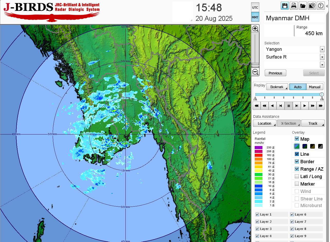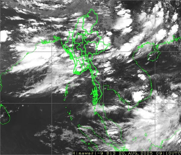 မိုးတိမ်တောင်ဖြစ်ပေါ်မှုအခြေအနေ။ ရန်ကုန်တိုင်းဒေသကြီး၊ ပဲခူးတိုင်းဒေသကြီး၊ မကွေးတိုင်းဒေသကြီး၊ စစ်ကိုင်းတိုင်းဒေသကြီးအထက်ပိုင်း၊ ဧရာဝတီတိုင်းဒေသကြီး၊ တနင်္သာရီတိုင်းဒေသကြီး၊ ကချင်ပြည်နယ်၊ ချင်းပြည်နယ်၊ ကရင်ပြည်နယ်နှင့် ရှမ်းပြည်နယ်တို့တွင် မိုးတိမ်တောင်များ ဖြစ်ထွန်းလျက်ရှိပြီး၊ အဆိုပါ မိုးတိမ်တောင်များ ရွေ့လျားရာနေရာတစ်လျှောက်တွင် မိုးရွာသွန်းခြင်းနှင့်အတူ လေပြင်းတိုက်ခတ်ခြင်း၊ မိုးထစ်ချုန်းခြင်း၊ မိုးကြိုးပစ်ခြင်း၊ လျှပ်စီးလက်ခြင်းနှင့် မိုးသီးကြွေခြင်းစသည့် မိုးလေဝသဖြစ်စဉ်များ ဖြစ်ပေါ်နိုင်ပါသဖြင့် ကြိုတင်သတိပြု နိုင်ပါရန် အကြံပြုအပ်ပါသည်။