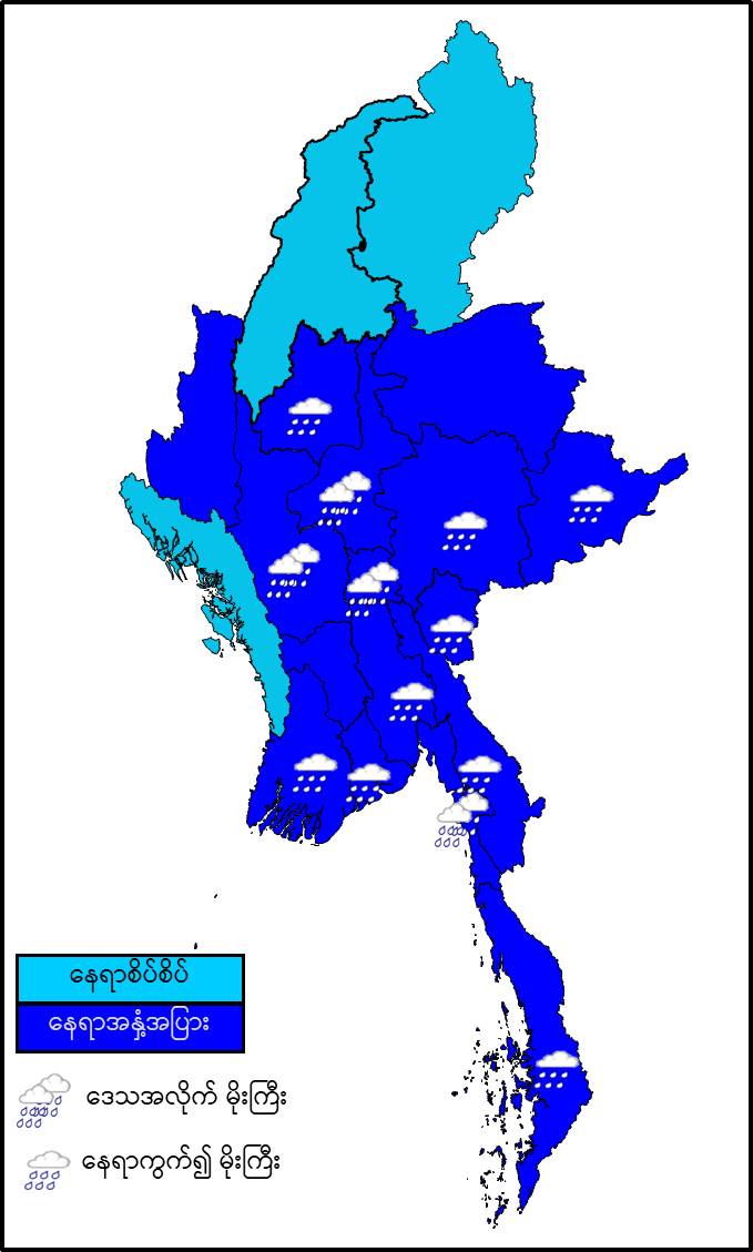 မနက်ဖြန်နံနက်အထိခန့်မှန်းချက်။ စစ်ကိုင်းတိုင်းဒေသကြီးအထက်ပိုင်း၊ ကချင်ပြည်နယ်နှင့် ရခိုင်ပြည်နယ်တို့တွင် နေရာစိပ်စိပ်နှင့် ကျန်တိုင်းဒေသကြီးနှင့် ပြည်နယ်တို့တွင် နေရာအနှံ့အပြား မိုးထစ်ချုန်းရွာပြီး၊ နေပြည်တော်၊ မန္တလေးတိုင်းဒေသကြီး၊ မကွေးတိုင်းဒေသကြီးနှင့် မွန်ပြည်နယ်တို့တွင် ဒေသအလိုက်နှင့် ရန်ကုန်တိုင်းဒေသကြီး၊ ပဲခူးတိုင်းဒေသကြီး၊ စစ်ကိုင်းတိုင်းဒေသကြီးအောက်ပိုင်း၊ ဧရာဝတီတိုင်းဒေသကြီး၊ တနင်္သာရီတိုင်းဒေသကြီး၊ ကယားပြည်နယ်၊ ကရင်ပြည်နယ်နှင့် ရှမ်းပြည်နယ်(တောင်ပိုင်းနှင့် အရှေ့ပိုင်း) တို့တွင် နေရာကွက်၍ မိုးကြီးနိုင်ပါသည်။ ရွာရန်ရာနှုန်းပြည့် ဖြစ်ပါသည်။