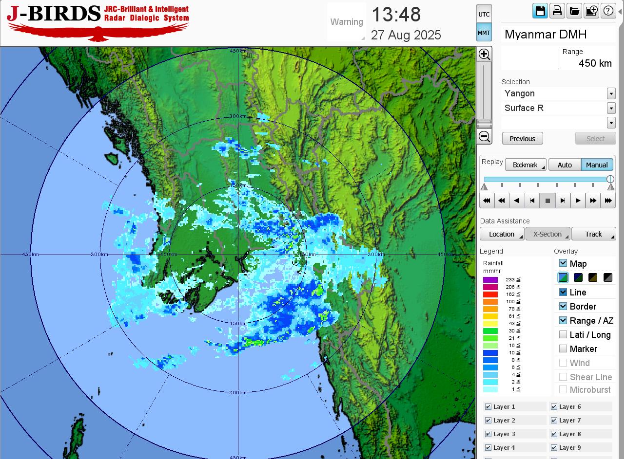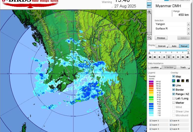 မိုးတိမ်တောင်ဖြစ်ပေါ်မှုအခြေအနေ။ နေပြည်တော်၊ ရန်ကုန်တိုင်းဒေသကြီး၊ မန္တလေးတိုင်းဒေသကြီး၊ ပဲခူးတိုင်းဒေသကြီး၊ စစ်ကိုင်းတိုင်းဒေသကြီး၊ ဧရာဝတီတိုင်းဒေသကြီး၊ တနင်္သာရီတိုင်းဒေသကြီး၊ ကယားပြည်နယ်၊ ကရင်ပြည်နယ်၊ ချင်းပြည်နယ်၊ မွန်ပြည်နယ်နှင့် ရှမ်းပြည်နယ်တို့တွင် မိုးတိမ်တောင်များ ဖြစ်ထွန်းမှုအားကောင်းလျက်ရှိပြီး၊ အဆိုပါ မိုးတိမ်တောင်များ ရွေ့လျားရာနေရာတစ်လျှောက်တွင် မိုးရွာသွန်းခြင်းနှင့်အတူ လေပြင်းတိုက်ခတ်ခြင်း၊ မိုးထစ်ချုန်းခြင်း၊ မိုးကြိုးပစ်ခြင်း၊ လျှပ်စီးလက်ခြင်းနှင့် မိုးသီးကြွေခြင်းစသည့် မိုးလေဝသဖြစ်စဉ်များ ဖြစ်ပေါ်နိုင်ပါသဖြင့် ကြိုတင်သတိပြုနိုင်ပါရန် အကြံပြုအပ်ပါသည်။