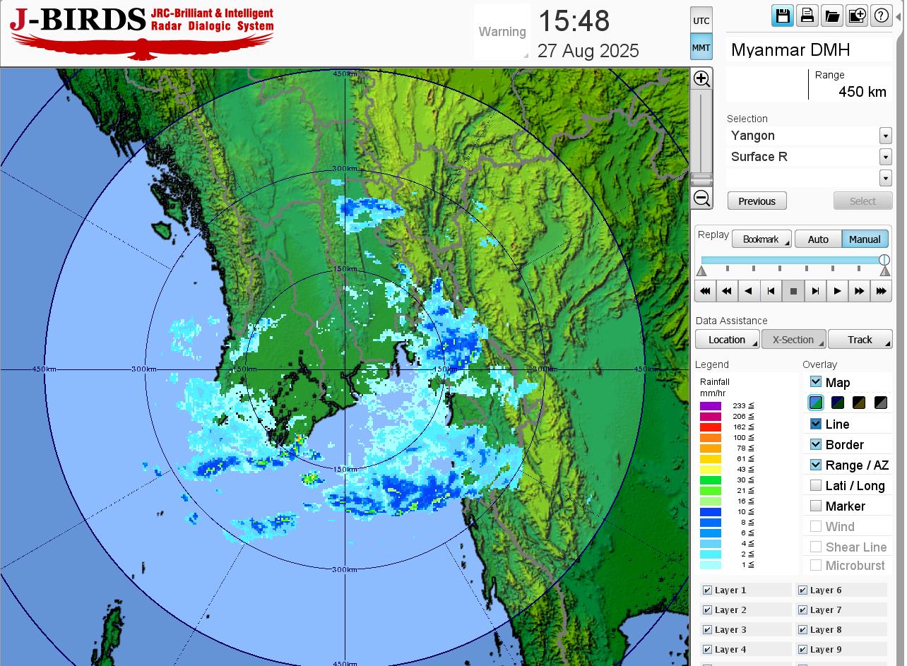 မိုးတိမ်တောင်ဖြစ်ပေါ်မှုအခြေအနေ။ နေပြည်တော်၊ ရန်ကုန်တိုင်းဒေသကြီး၊ မန္တလေးတိုင်းဒေသကြီး၊ ပဲခူးတိုင်းဒေသကြီး၊ မကွေးတိုင်းဒေသကြီး၊ စစ်ကိုင်းတိုင်းဒေသကြီးအထက်ပိုင်း၊ ဧရာဝတီတိုင်းဒေသကြီး၊ တနင်္သာရီတိုင်းဒေသကြီး၊ ကချင်ပြည်နယ်၊ ကယားပြည်နယ်၊ ကရင်ပြည်နယ်၊ ချင်းပြည်နယ်၊ မွန်ပြည်နယ်နှင့် ရှမ်းပြည်နယ်တို့တွင် မိုးတိမ်တောင်များ ဖြစ်ထွန်းမှု အားကောင်းလျက်ရှိပြီး၊ အဆိုပါ မိုးတိမ်တောင်များ ရွေ့လျားရာနေရာတစ်လျှောက်တွင် မိုးရွာသွန်းခြင်းနှင့်အတူ လေပြင်းတိုက်ခတ်ခြင်း၊ မိုးထစ်ချုန်းခြင်း၊ မိုးကြိုးပစ်ခြင်း၊ လျှပ်စီးလက်ခြင်းနှင့် မိုးသီးကြွေခြင်းစသည့် မိုးလေဝသဖြစ်စဉ်များ ဖြစ်ပေါ်နိုင်ပါသဖြင့် ကြိုတင်သတိပြုနိုင်ပါရန် အကြံပြုအပ်ပါသည်။