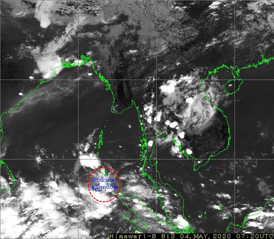 ဘင်္ဂလားပင်လယ်အော်အခြေအနေ။ ယနေ့မြန်မာစံတော်ချိန် (၁၃:၃၀)နာရီအချိန် တိုင်းထွာချက်များအရ ကပ္ပလီပင်လယ်ပြင်တောင်ပိုင်းနှင့် ယင်းနှင့်ဆက်စပ်လျက်ရှိသော ဘင်္ဂလားပင်လယ်အော်အရှေ့တောင်ပိုင်းတို့တွင် ဖြစ်ပေါ်နေသော လေဖိအားနည်းရပ်ဝန်းသည် ဆက်လက်တည်ရှိနေပါသည်။ ဘင်္ဂလားပင်လယ်အော်တောင်ပိုင်းတွင် တိမ်ထူထပ်နေပြီး၊ ကပ္ပလီပင်လယ်ပြင်နှင့် ကျန်ဘင်္ဂလားပင်လယ်အော်တို့တွင် တိမ်အနည်းငယ်မှ တိမ်အသင့်အတင့် ဖြစ်ထွန်းနေပါသည်။