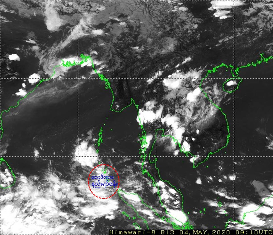 ဘင်္ဂလားပင်လယ်အော်အ‌ခြေအနေ။ ယနေ့မြန်မာစံတော်ချိန် (၁၃:၃၀)နာရီအချိန် တိုင်းထွာချက်များအရ ကပ္ပလီပင်လယ်ပြင်တောင်ပိုင်းနှင့် ယင်းနှင့်ဆက်စပ်လျက်ရှိသော ဘင်္ဂလားပင်လယ်အော် အရှေ့တောင်ပိုင်းတို့တွင် ဖြစ်ပေါ်နေသော လေဖိအားနည်းရပ်ဝန်းသည် ဆက်လက်တည်ရှိနေပါသည်။ ဘင်္ဂလားပင်လယ်အော်တောင်ပိုင်းတွင် တိမ်ထူထပ်နေပြီး၊ ကပ္ပလီပင်လယ်ပြင်နှင့် ကျန်ဘင်္ဂလားပင်လယ်အော်တို့တွင် တိမ်အနည်းငယ်မှ တိမ်အသင့်အတင့် ဖြစ်ထွန်းနေပါသည်။