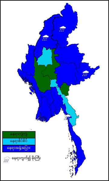 မနက်ဖြန်နံနက်အထိခန့်မှန်းချက်။ မန္တလေးတိုင်းဒေသကြီး၊ မကွေးတိုင်းဒေသကြီးနှင့် ကယားပြည်နယ်တို့တွင် နေရာကျဲကျဲ၊ နေပြည်တော်၊ စစ်ကိုင်းတိုင်းဒေသကြီးအောက်ပိုင်းနှင့် ကရင်ပြည်နယ်တို့တွင် နေရာစိပ်စိပ်နှင့် ကျန်တိုင်းဒေသကြီးနှင့် ပြည်နယ်တို့တွင် နေရာအနှံ့အပြား မိုးထစ်ချုန်းရွာပြီး၊ စစ်ကိုင်းတိုင်းဒေသကြီးအထက်ပိုင်း၊ ကချင်ပြည်နယ်၊ မွန်ပြည်နယ်နှင့် ရှမ်းပြည်နယ်(အရှေ့ပိုင်း)တို့တွင် နေရာကွက်၍ မိုးကြီးနိုင်ပါသည်။