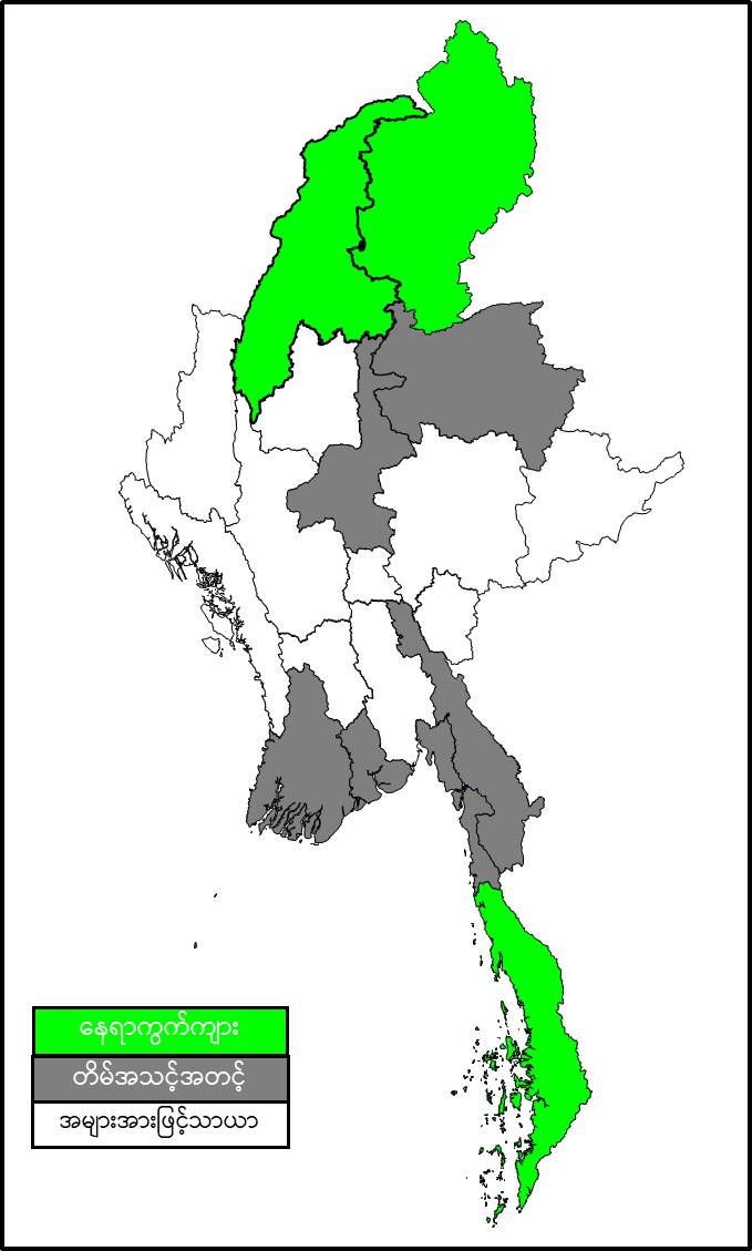 မနက်ဖြန်နံနက်အထိခန့်မှန်းချက်။ စစ်ကိုင်းတိုင်းဒေသကြီးအထက်ပိုင်း၊ တနင်္သာရီတိုင်းဒေသကြီးနှင့် ကချင်ပြည်နယ်တို့တွင် နေရာကွက်ကျား မိုးအနည်းငယ် ထစ်ချုန်းရွာနိုင်ပါသည်။ ရွာရန်ရာနှုန်း(၆၀) ဖြစ်ပါသည်။ မန္တလေးတိုင်းဒေသကြီး၊ ရန်ကုန်တိုင်းဒေသကြီး၊ ဧရာဝတီတိုင်းဒေသကြီး၊ ရှမ်းပြည်နယ်(မြောက်ပိုင်း)၊ ကရင်ပြည်နယ်နှင့် မွန်ပြည်နယ်တို့တွင် တိမ်အသင့်အတင့် ဖြစ်ထွန်းပြီး၊ ကျန်တိုင်းဒေသကြီးနှင့် ပြည်နယ်တို့တွင် အများအားဖြင့် သာယာမည်။