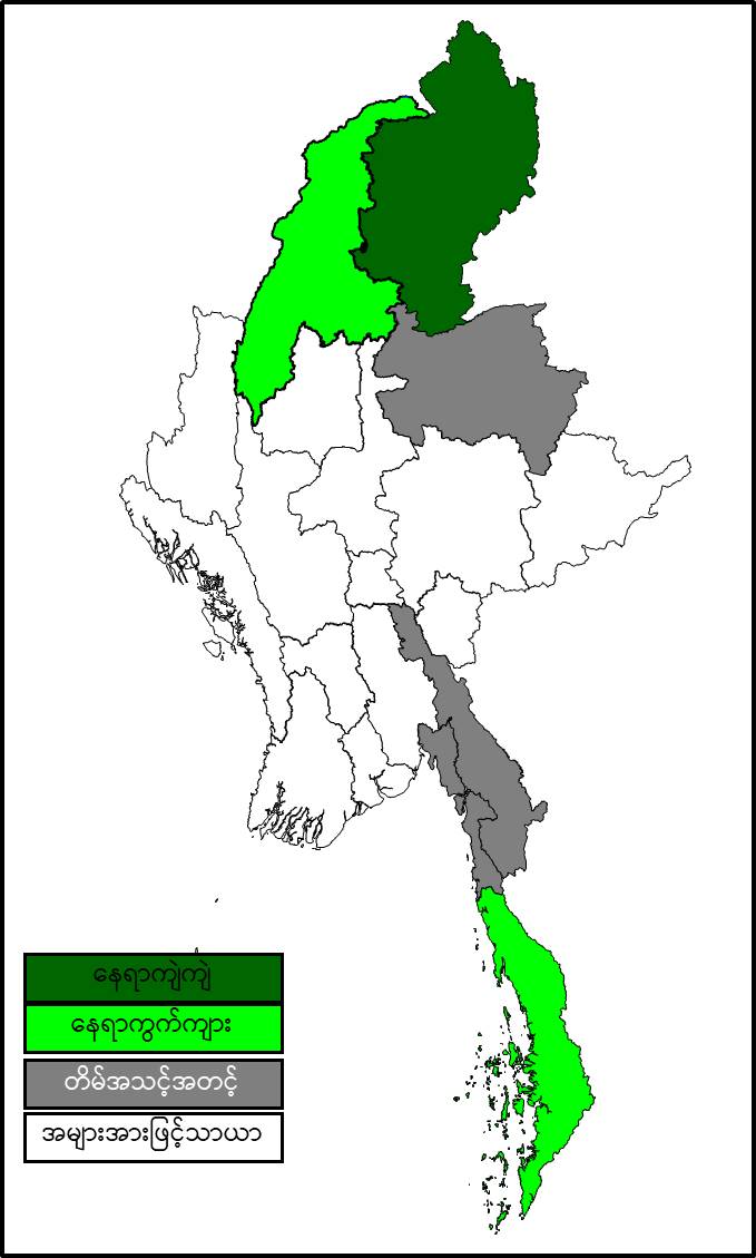 မနက်ဖြန်နံနက်အထိခန့်မှန်းချက်။ ကချင်ပြည်နယ်တွင် နေရာကျဲကျဲနှင့် စစ်ကိုင်းတိုင်းဒေသကြီးအထက်ပိုင်းနှင့် တနင်္သာရီတိုင်းဒေသကြီးတို့တွင် နေရာကွက်ကျား မိုးရွာမည်။ ရွာရန်ရာနှုန်း ၈၀ ဖြစ်ပါသည်။ ကရင်ပြည်နယ်၊ မွန်ပြည်နယ်နှင့် ရှမ်းပြည်နယ်(မြောက်ပိုင်း)တို့တွင် တိမ်အသင့်အတင့် ဖြစ်ထွန်းပြီး၊ ကျန်တိုင်းဒေသကြီးနှင့် ပြည်နယ်တို့တွင် အများအားဖြင့် သာယာမည်။
