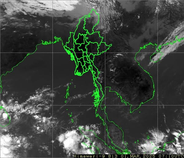 ယမန်နေ့နံနက်(၀၉:၃၀)နာရီအချိန်မှ ယနေ့နံနက်(၀၉:၃၀)နာရီအချိန်အထိ မိုးလေဝသ တိုင်းထွာချက်အကျဉ်းချုပ်။ လွန်ခဲ့သော(၂၄)နာရီအတွင်းက ရန်ကုန်တိုင်းဒေသကြီးနှင့် ကချင်ပြည်နယ်တို့တွင် နေရာကွက်ကျား မိုးအနည်းငယ် ရွာခဲ့ပါသည်။ စစ်ကိုင်းတိုင်းဒေသကြီးအထက်ပိုင်း၊ ဧရာဝတီတိုင်းဒေသကြီး၊ တနင်္သာရီတိုင်းဒေသကြီး၊ ကရင်ပြည်နယ်နှင့် မွန်ပြည်နယ်တို့တွင် တိမ်အသင့်အတင့် ဖြစ်ထွန်းခဲ့ပြီး၊ ကျန်တိုင်းဒေသကြီးနှင့် ပြည်နယ် တို့တွင် အများအားဖြင့် သာယာခဲ့ပါသည်။ နေ့အပူချိန်များမှာ မွန်ပြည်နယ်တွင် မတ်လ၏ ပျမ်းမျှအပူချိန်ထက် (၂) ဒီဂရီဆဲလ်စီးယပ် ပိုခဲ့ပြီး၊ ကျန်တိုင်းဒေသကြီးနှင့် ပြည်နယ်တို့တွင် မတ်လ၏ ပျမ်းမျှ အပူချိန်ခန့်သာ ရှိခဲ့ပါသည်။ ထူးခြားသည့် နေ့အပူချိန်များမှာ မြဝတီမြို့တွင် ၃၉.၅ ဒီဂရီဆဲလ်စီးယပ်၊ ပြည်မြို့တွင် ၃၉.၄ ဒီဂရီဆဲလ်စီးယပ်၊ အောင်လံမြို့တွင် ၃၉.၀ ဒီဂရီဆဲလ်စီးယပ်၊ ဘားအံ(စိုက်ပျိုးရေးမိုးလေဝသ)နှင့် မော်လမြိုင်မြို့တို့တွင် ၃၈.၈ ဒီဂရီဆဲလ်စီးယပ်စီ၊ ပဲခူးမြို့နှင့် သိမ်ဇရပ်မြို့တို့တွင် ၃၈.၆ ဒီဂရီဆဲလ်စီးယပ်စီ၊ ညောင်လေးပင်မြို့၊ ဘားအံမြို့နှင့် ဘီးလင်းမြို့တို့တွင် ၃၈.၄ ဒီဂရီဆဲလ်စီးယပ်စီ၊ သာစည်(လှိုင်းတက်)တွင် ၃၈.၂ ဒီဂရီဆဲလ်စီးယပ်၊ ရမည်းသင်းမြို့၊ သာယာဝတီမြို့နှင့် ဝက်ထီးကန်(လေးထပ်ပြင်)တို့တွင် ၃၈.၀ ဒီဂရီဆဲလ်စီးယပ်စီ၊ ရွှေကျင်မြို့တွင် ၃၇.၉ ဒီဂရီဆဲလ်စီးယပ်နှင့် တောင်ငူမြို့၊ မကွေးမြို့နှင့် သထုံမြို့တို့တွင် ၃၇.၈ ဒီဂရီဆဲလ်စီးယပ်စီတို့ ဖြစ်ကြပါသည်။