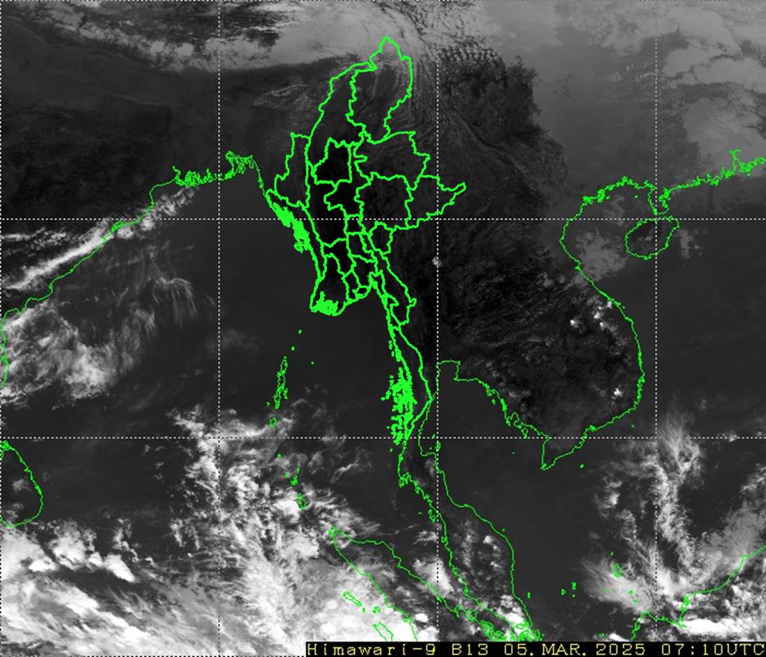 ယမန်နေ့နံနက်(၀၉:၃၀)နာရီအချိန်မှ ယနေ့နံနက်(၀၉:၃၀)နာရီအချိန်အထိ မိုးလေဝသ တိုင်းထွာချက်အကျဉ်းချုပ်။ လွန်ခဲ့သော(၂၄)နာရီအတွင်းက စစ်ကိုင်းတိုင်း‌ဒေသကြီးအထက်ပိုင်း၊ တနင်္သာရီတိုင်းဒေသကြီး၊ ကချင်ပြည်နယ်၊ ကရင်ပြည်နယ်နှင့် မွန်ပြည်နယ်တို့တွင် တိမ်အသင့်အတင့် ဖြစ်ထွန်းခဲ့ပြီး၊ ကျန်တိုင်းဒေသကြီးနှင့် ပြည်နယ်တို့တွင် အများအားဖြင့် သာယာခဲ့ပါသည်။ နေ့အပူချိန်များမှာ ပဲခူးတိုင်း‌ဒေသကြီး၊ စစ်ကိုင်းတိုင်း‌ဒေသကြီးအထက်ပိုင်း၊ ချင်းပြည်နယ်၊ ရခိုင်ပြည်နယ်နှင့် ရှမ်းပြည်နယ်(အရှေ့ပိုင်း)တို့တွင် မတ်လ၏ ပျမ်းမျှအပူချိန်တို့ထက် ၂ ဒီဂရီဆဲလ်စီးယပ် ပိုခဲ့ပြီး၊ ကချင်ပြည်နယ်တွင် မတ်လ၏ ပျမ်းမျှအပူချိန်အောက် ၂ ဒီဂရီဆဲလ်စီးယပ် လျော့နည်းခဲ့ကာ၊ ကျန်တိုင်းဒေသကြီးနှင့် ပြည်နယ်တို့တွင် မတ်လ၏ ပျမ်းမျှအပူချိန်ခန့်သာ ရှိခဲ့ပါသည်။ ၄-၃-၂၀၂၅ ရက်နေ့တွင် ဖြစ်ပေါ်ခဲ့သော ထူးခြားသည့် နေ့အပူချိန်များမှာ ချောက်မြို့တွင် ၃၉.၉ ဒီဂရီဆဲလ်စီးယပ်၊ ကော့ကရိတ်မြို့တွင် ၃၉.၀ ဒီဂရီဆဲလ်စီးယပ်၊ မကွေးမြို့တွင် ၃၈.၈ ဒီဂရီဆဲလ်စီးယပ်၊ ညောင်လေးပင်မြို့တွင် ၃၈.၇ ဒီဂရီဆဲလ်စီးယပ်၊ ပြည်မြို့တွင် ၃၈.၆ ဒီဂရီဆဲလ်စီးယပ်၊ ရွှေကျင်မြို့နှင့် မြဝတီမြို့တို့တွင် ၃၈.၅ ဒီဂရီဆဲလ်စီးယပ်စီ၊ အောင်လံမြို့တွင် ၃၈.၄ ဒီဂရီဆဲလ်စီးယပ်နှင့် မြင်းခြံမြို့နှင့် သိမ်ဇရပ်မြို့တို့တွင် ၃၈.၂ ဒီဂရီဆဲလ်စီးယပ်စီတို့ ဖြစ်ကြပါသည်။