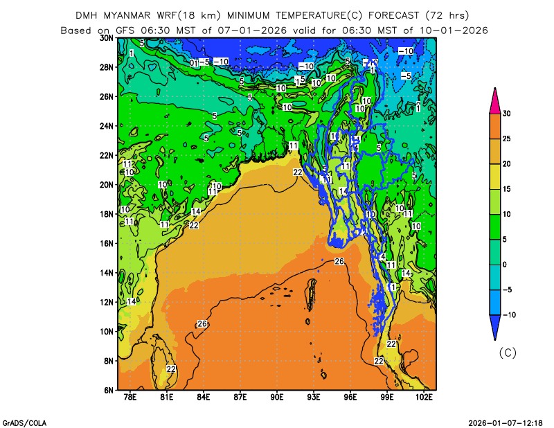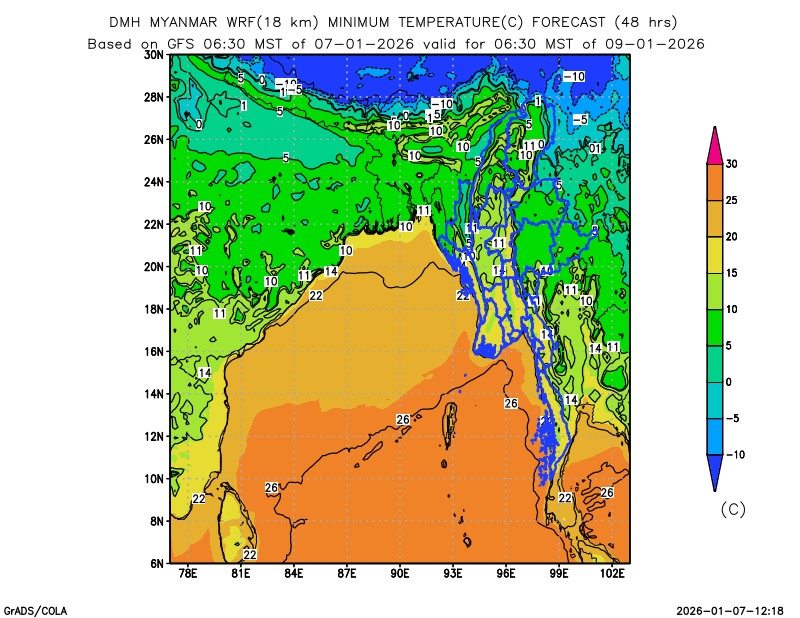 ယမန်နေ့နံနက် ၀၉:၃၀ နာရီအချိန်မှ ယနေ့နံနက် ၀၉:၃၀ နာရီအချိန်အထိ မိုးလေဝသတိုင်းထွာချက် အကျဉ်းချုပ်။ လွန်ခဲ့သော ၂၄ နာရီအတွင်းက ပဲခူးတိုင်းဒေသကြီး၊ ကယားပြည်နယ်နှင့် ချင်းပြည်နယ်တို့တွင် အများအားဖြင့် သာယာခဲ့ပြီး ကျန်တိုင်းဒေသကြီးနှင့် ပြည်နယ်တို့တွင် တိမ်အသင့်အတင့် ဖြစ်ထွန်းခဲ့ပါသည်။ ညအပူချိန်များမှာ မန္တလေးတိုင်းဒေသကြီး၊ ပဲခူးတိုင်းဒေသကြီး၊ ကယားပြည်နယ်၊ ချင်းပြည်နယ်၊ ရခိုင်ပြည်နယ်နှင့် ရှမ်းပြည်နယ် (မြောက်ပိုင်း နှင့် အရှေ့ပိုင်း) တို့တွင် ဇန်နဝါရီလ၏ ပျမ်းမျှအပူချိန်တို့အောက် ၂ ဒီဂရီဆဲလ်စီးယပ်လျော့နည်းခဲ့ပြီး ကျန်တိုင်းဒေသကြီးနှင့် ပြည်နယ်တို့တွင် ဇန်နဝါရီလ၏ ပျမ်းမျှအပူချိန်ခန့်သာ ရှိခဲ့ပါသည်။ ထူးခြားသည့် ညအပူချိန်များမှာ ဟားခါးမြို့တွင် -၀.၆ ဒီဂရီဆဲလ်စီးယပ်၊ နမ့်စန်မြို့ (ရှမ်းပြည်နယ်တောင်ပိုင်း) တွင် ၂.၇ ဒီဂရီဆဲလ်စီးယပ်၊ ဟဲဟိုးမြို့တွင် ၃.၃ ဒီဂရီဆဲလ်စီးယပ်၊ လွိုင်လင်မြို့တွင် ၃.၄ ဒီဂရီဆဲလ်စီးယပ်၊ တီးတိန်မြို့တွင် ၄.၀ ဒီဂရီဆဲလ်စီးယပ်၊ ပူတာအိုမြို့တွင် ၄.၆ ဒီဂရီဆဲလ်စီးယပ်၊ မိုင်းယန်းမြို့တွင် ၅.၀ ဒီဂရီဆဲလ်စီးယပ်၊ ပင်လောင်းမြို့တွင် ၅.၄ ဒီဂရီဆဲလ်စီးယပ်၊ သီပေါမြို့တွင် ၅.၅ ဒီဂရီဆဲလ်စီးယပ်နှင့် နောင်ချိုမြို့တွင် ၆.၆ ဒီဂရီဆဲလ်စီးယပ်တို့ ဖြစ်ကြပါသည်။
