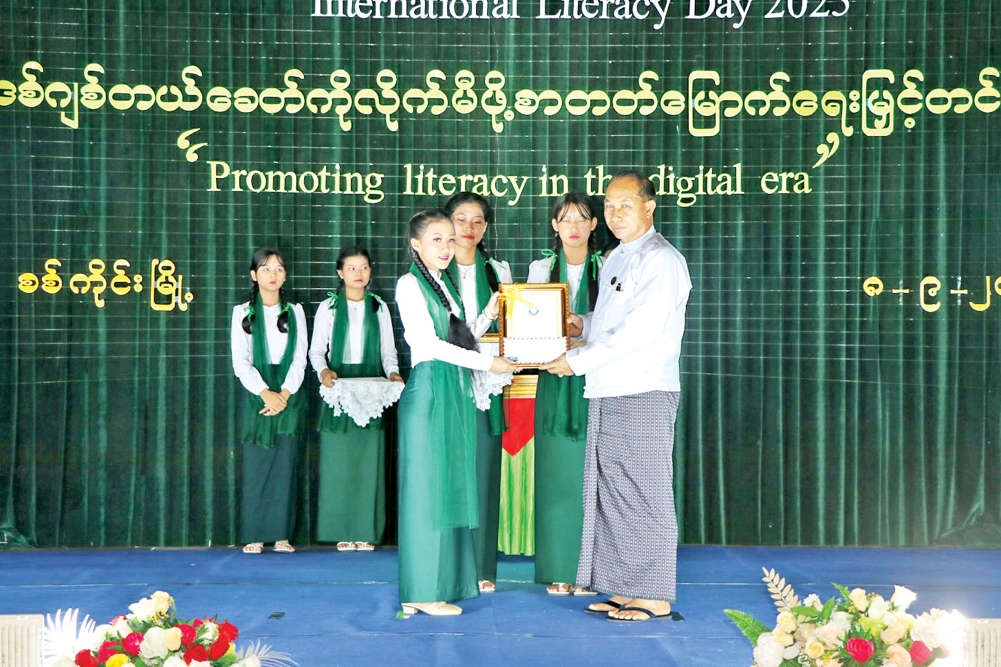 ယင်းနောက် ၂၀၂၅ ခုနှစ် နိုင်ငံတကာစာတတ်မြောက်ရေးနေ့အထိမ်းအမှတ် Video Clip အား ကြည့်ရှုအားပေးကြပြီး တိုင်းဒေသကြီးဝန်ကြီးချုပ်၊ တိုင်းဒေသကြီးလူမှုရေးရာဝန်ကြီး၊ စစ်ကိုင်းမြို့ပေါ်ရှိ တက္ကသိုလ်များမှ ပါမောက္ခချုပ်များ၊ တိုင်းဒေသကြီးအဆင့် ဌာနဆိုင်ရာများက ၂၀၂၅ ခုနှစ် နိုင်ငံတကာ စာတတ်မြောက်ရေးနေ့အထိမ်းအမှတ် အထက်တန်း၊ အလယ်တန်း၊ မူလတန်း စာစီစာကုံးပြိုင်ပွဲ၊ ကဗျာပြိုင်ပွဲ၊ ပန်းချီပြိုင်ပွဲနှင့် ဆောင်းပါးပြိုင်ပွဲတို့တွင် ပထမဆု၊ ဒုတိယဆု၊ တတိယဆု ရရှိခဲ့ကြသည့် ကျောင်းသား ကျောင်းသူများအား ဂုဏ်ပြုချီးမြှင့်ငွေများနှင့် ဂုဏ်ပြုဆုလက်မှတ်များ ပေးအပ်ချီးမြှင့်ကြသည်။