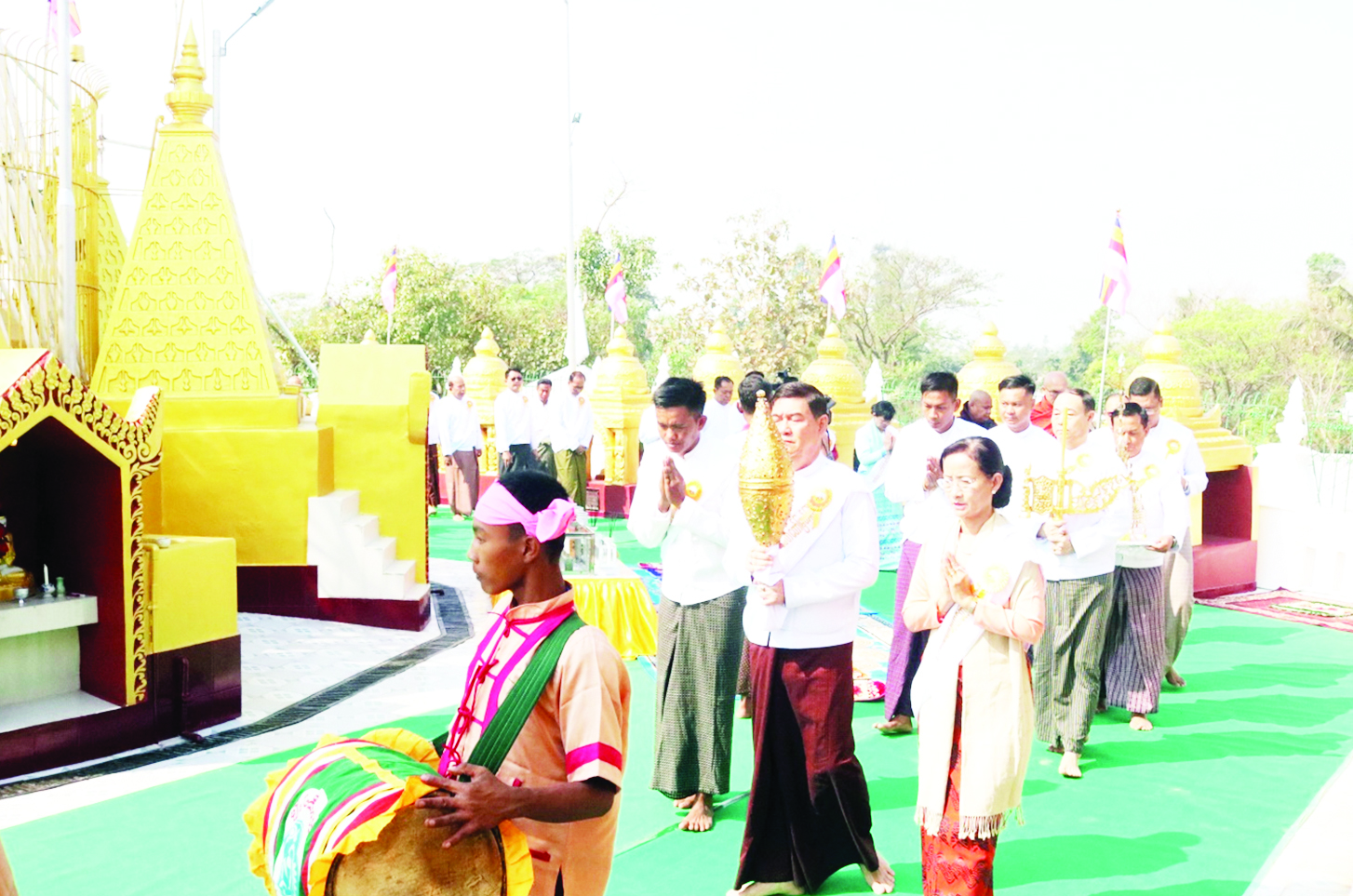 ဆက်လက်၍ ပြည်နယ် ဝန်ကြီးချုပ်၊ တိုင်းမှူးနှင့် တက် ရောက်လာကြသူများက ဆရာတော်၊ သံဃာတော်များ ရွတ်ပွား ချီးမြှင့်တော်မူသော ပရိတ်တရားတော်များကို နာယူကြည်ညိုကြပြီး စိန်ဖူးတော်၊ ငှက်မြတ်နားတော်များအား ပင့်ဆောင်၍ တင်လှူပူဇော်ခဲ့ကြသည်။