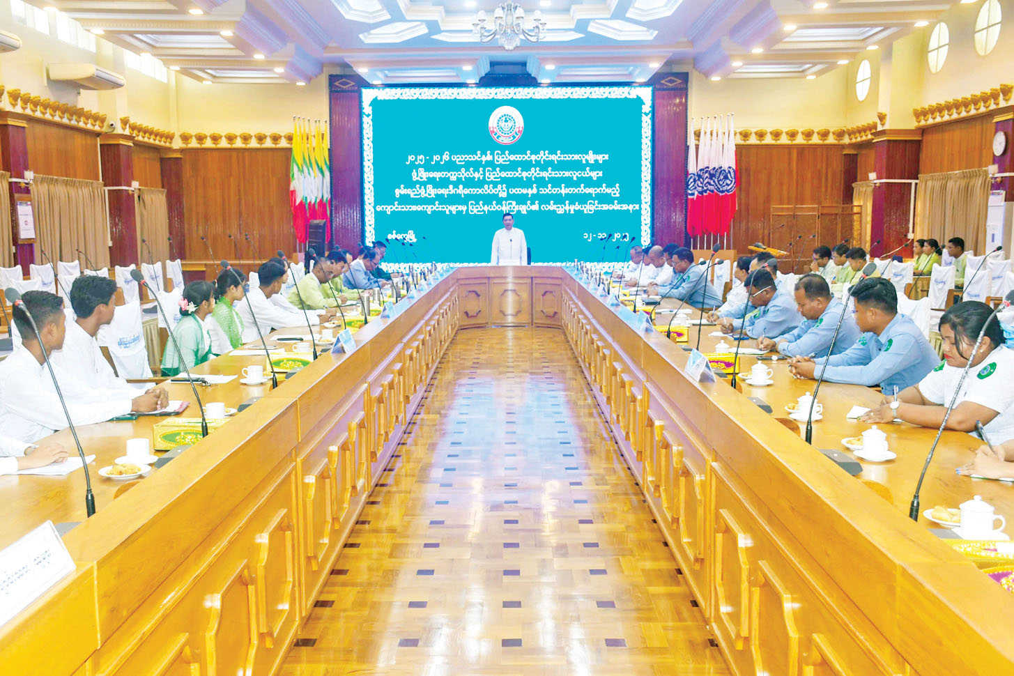 ၂၀၂၅-၂၀၂၆ ပညာသင်နှစ် ပြည်ထောင်စုတိုင်းရင်းသားလူမျိုးများ ဖွံ့ဖြိုးရေးတက္ကသိုလ်နှင့် ပြည်ထောင်စုတိုင်းရင်းသားလူငယ်များ စွမ်းရည်ဖွံ့ဖြိုးရေး ဒီဂရီကောလိပ်တို့၌ ပထမနှစ်သင်တန်း တက်ရောက်မည့် ကျောင်းသား ကျောင်းသူများက ပြည်နယ်ဝန်ကြီးချုပ်ထံမှ သြဝါဒခံယူခြင်းကို ယနေ့မွန်းလွဲပိုင်းတွင် ရခိုင်ပြည်နယ်အစိုးရအဖွဲ့ရုံး အစည်းအဝေးခန်းမ၌ ကျင်းပရာ ရခိုင်ပြည်နယ် ဝန်ကြီးချုပ် ဦးထိန်လင်း၊ ပြည်နယ်ဝန်ကြီးများ၊ ဌာနဆိုင်ရာများ၊ ကျောင်းသား ကျောင်းသူများ တက်ရောက်ကြသည်။