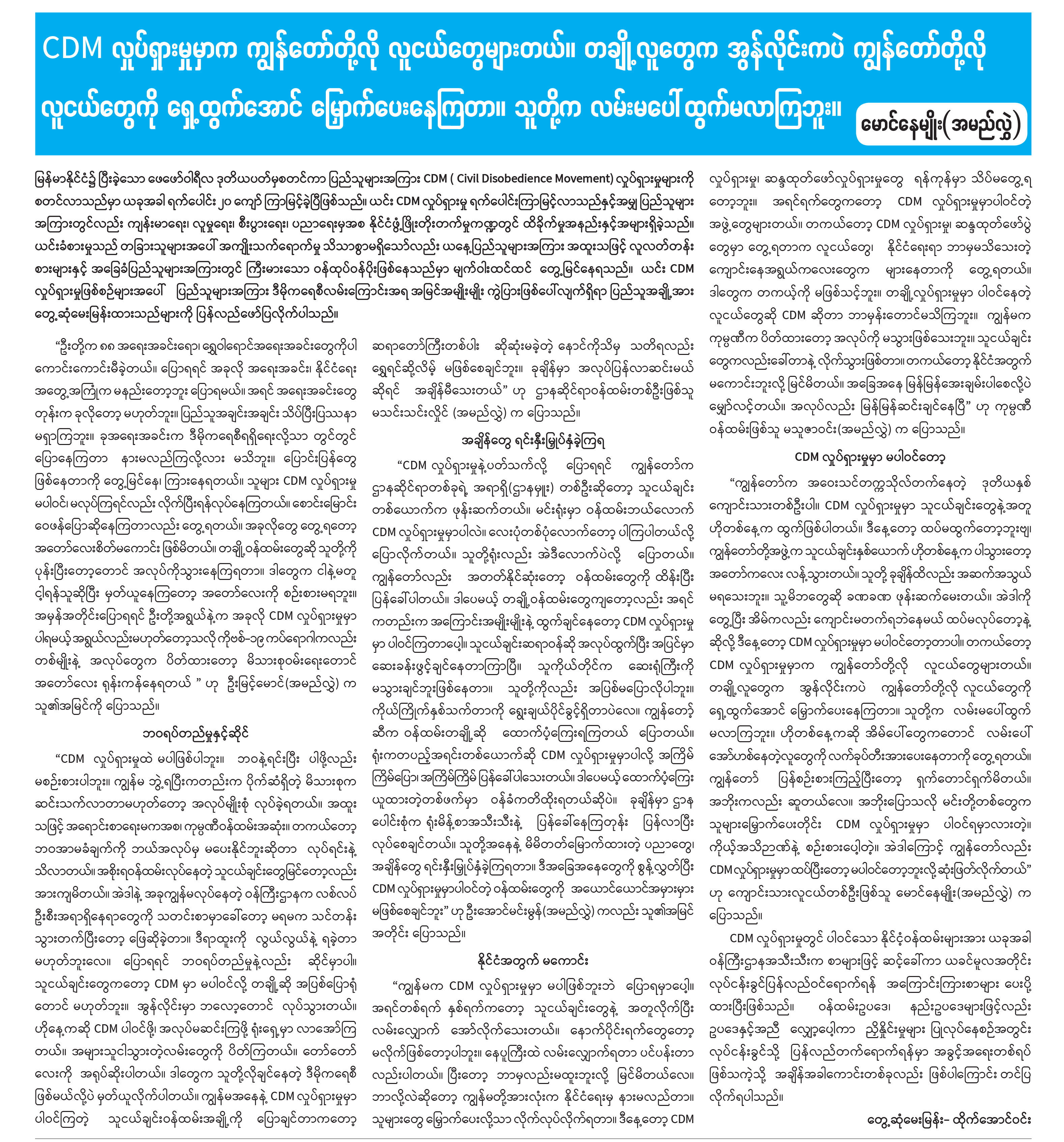 CDM လှုပ်ရှားမှုမှာက ကျွန်တော်တို့လို လူငယ်တွေများတယ်။ တချို့လူတွေက အွန်လိုင်းကပဲ ကျွန်တော်တို့လို လူငယ်တွေကို ရှေ့ထွက်အောင် မြှောက်ပေးနေကြတာ။ သူတို့က လမ်းမပေါ်ထွက်မလာကြဘူး။