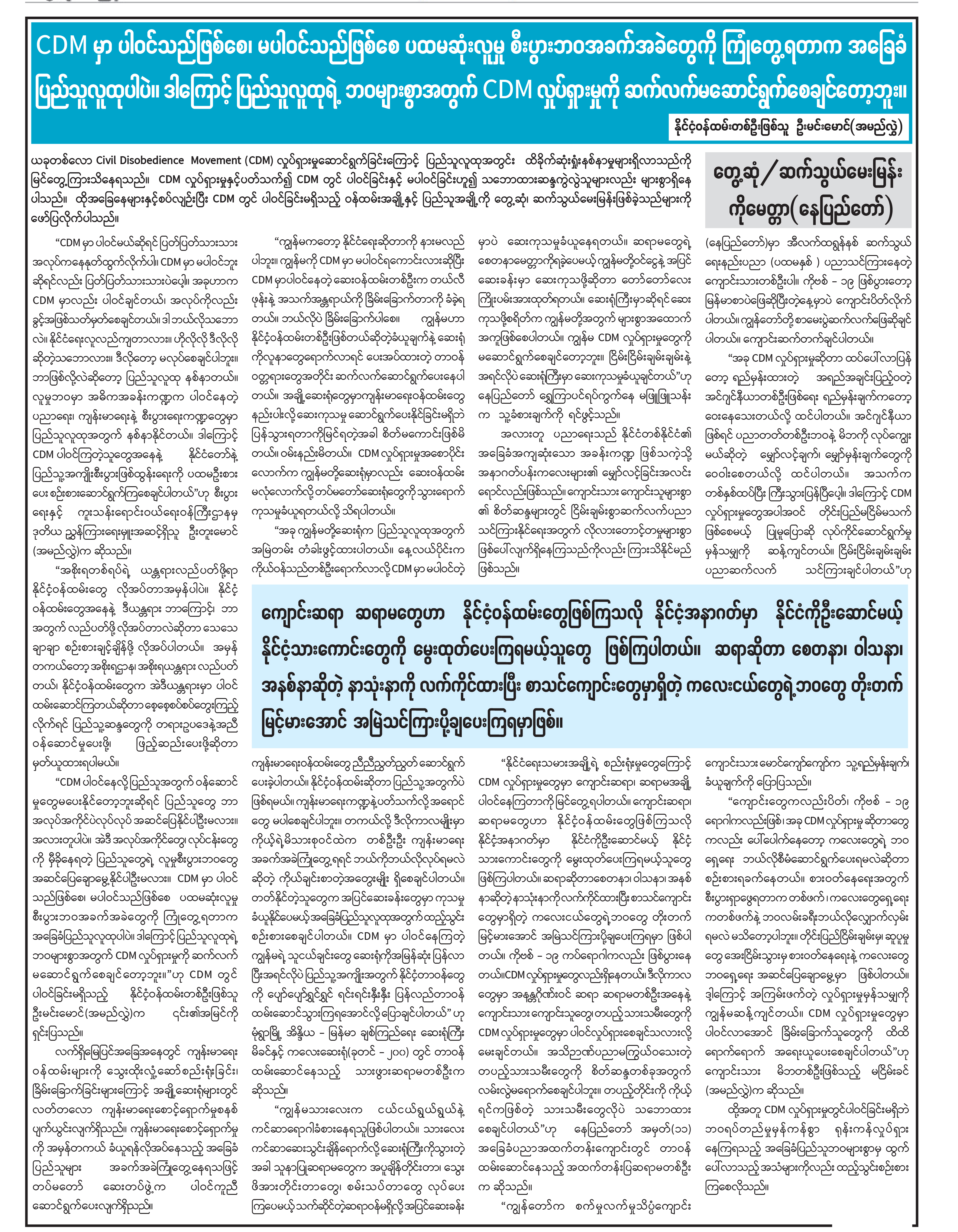 CDM မှာ ပါဝင်သည်ဖြစ်စေ၊ မပါဝင်သည်ဖြစ်စေ ပထမဆုံးလူမှု စီးပွားဘဝအခက်အခဲတွေကို ကြုံတွေ့ရတာက အခြေခံ ပြည်သူလူထုပါပဲ။ ဒါကြောင့် ပြည်သူလူထုရဲ့ ဘဝများစွာအတွက် CDM လှုပ်ရှားမှုကို ဆက်လက်မဆောင်ရွက်စေချင်တော့ဘူး။ နိုင်ငံ့ဝန်ထမ်းတစ်ဦးဖြစ်သူ