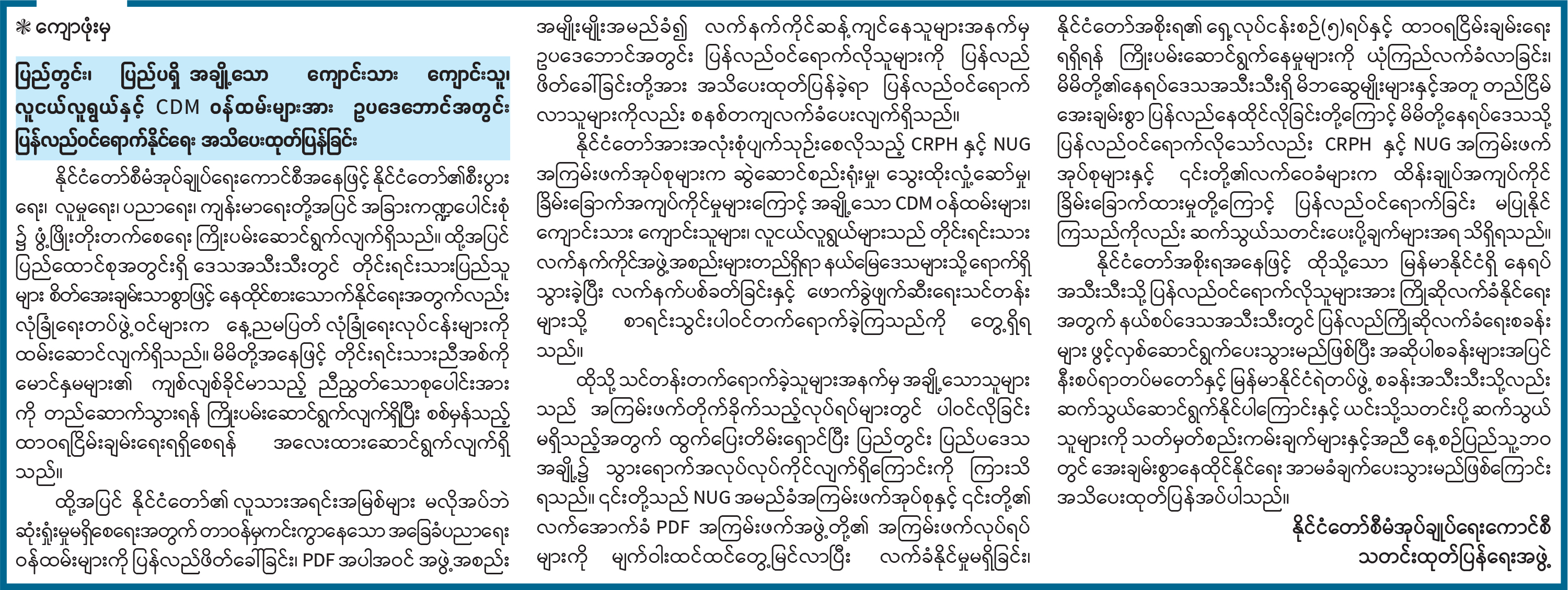 CDM ဝန်ထမ်းများ၊ ကျောင်းသား ကျောင်းသူများနှင့် လူငယ်လူရွယ်များအား ကြိုဆိုရေးစခန်းများ ဖွင့်လှစ်လက်ခံခြင်းနှင့် နီးစပ်ရာလုံခြုံရေးစခန်းများ၌ လက်ခံခြင်း ဆောင်ရွက်သွားမည်ဖြစ်ကြောင်း အသိပေးကြေညာချက် ထုတ်ပြန်