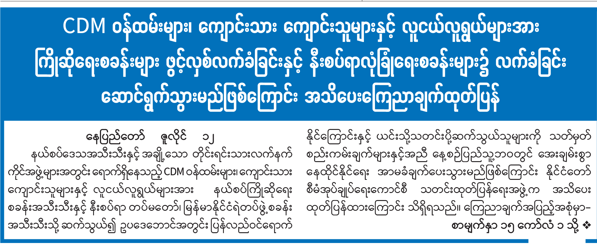 CDM ဝန်ထမ်းများ၊ ကျောင်းသား ကျောင်းသူများနှင့် လူငယ်လူရွယ်များအား ကြိုဆိုရေးစခန်းများ ဖွင့်လှစ်လက်ခံခြင်းနှင့် နီးစပ်ရာလုံခြုံရေးစခန်းများ၌ လက်ခံခြင်း ဆောင်ရွက်သွားမည်ဖြစ်ကြောင်း အသိပေးကြေညာချက်ထုတ်ပြန်