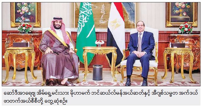 အီဂျစ်နိုင်ငံသို့ နှစ်ရက်ကြာ အလည်အပတ်ခရီး ရောက်ရှိလာသည့် ဆော်ဒီအိမ်ရှေ့မင်းသား ဘင်ဆယ်လ်မန် အယ်ဆတ်သည် အီဂျစ်သမ္မတ စီစီနှင့် နယ်ပယ်စုံကဏ္ဍစုံတွင် နှစ်နိုင်ငံဆက်ဆံရေးတိုးမြှင့်သွားရန် နည်းလမ်းများကို ဆွေးနွေးသွား မည်ဖြစ်ကြောင်း သိရသည်။