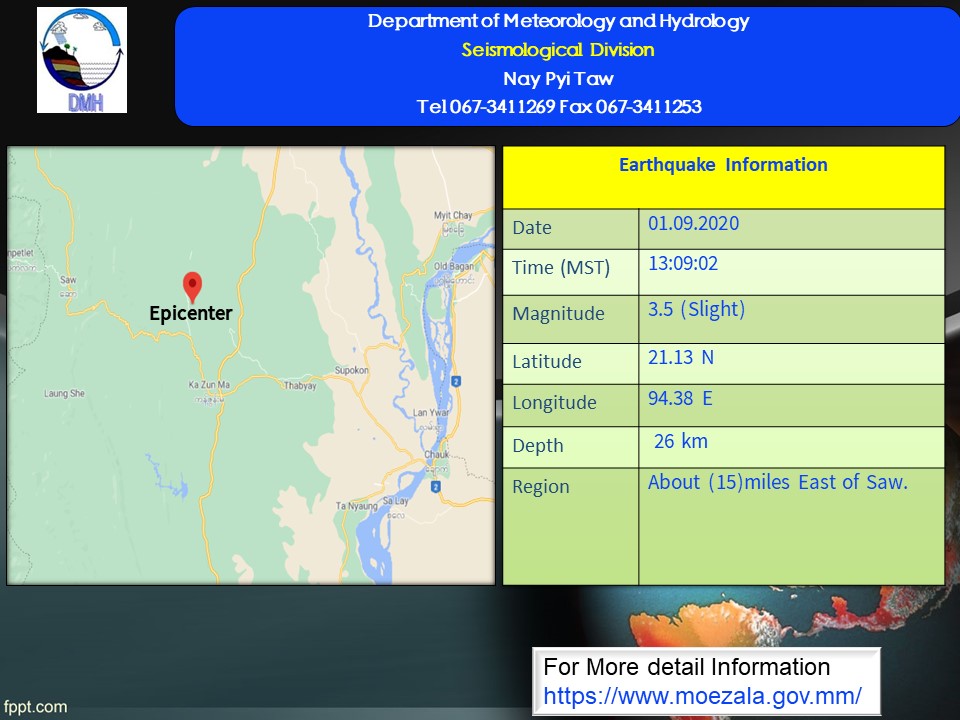 ၂၀၂၀ ပြည့်နှစ်၊ စက်တင်ဘာလ(၁) ရက်နေ့၊ မြန်မာစံတော်ချိန် (၁၃) နာရီ၊ (ဝ၉) မိနစ်၊ (ဝ၂)စက္ကန့် အချိန်တွင် ညောင်ဦးမြေငလျင်စခန်းမှ အနောက်ဘက် (၃၄) မိုင် ခန့်ကွာဝေးသော မြန်မာနိုင်ငံပြည်တွင်း (ဆောမြို့၏ အရှေ့ဘက် (၁၅)မိုင်ခန့်အကွာ) မြောက်လတ္တီတွဒ် (၂၁.၁၃) ဒီဂရီ၊ အရှေ့ လောင်ဂျီတွဒ် (၉၄.၃၈)ဒီဂရီ၊ အနက်(၂၆)ကီလိုမီတာကို ဗဟိုပြု၍ အင်အားရစ်(ခ်)တာစကေး (၃.၅)အဆင့်ရှိ အင်အားအနည်းငယ်ရှိသော မြေငလျင်တစ်ခု လှုပ်ရှားသွားကြောင်း တိုင်းထွာရရှိပါသည်။