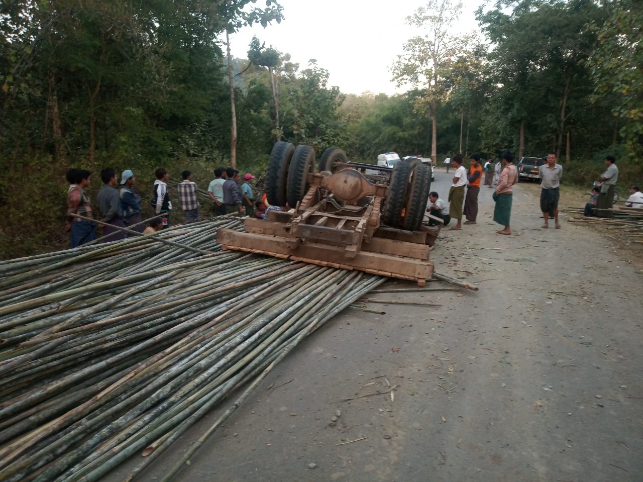 မကွေးတိုင်းဒေသကြီး၊ ဂန့်ဂေါခရိုင်၊ ဆောမြို့နယ်၊ ဆော-ဆိပ်ဖြူကားလမ်း၊ မိုင်တိုင်အမှတ် (၅၀/၃)နှင့် (၅၀/၄)ကြား၊ သုံးလံပြည့်ကျေးရွာ၊ ထယ်ပင်သစ်ဆိပ်အနီးတွင်  ဇန်နဝါရီ ၈ ရက် ညနေ ၅ နာရီ ၁၅ မိနစ်ခန့်က (၆)ဘီး ယာဉ်(၁)စီးသည် ယားခင်းထဲမှ ဝါးများတင်ဆောင်လာပြီး မောင်းနှင်လာစဉ် လမ်းကွေ့၌ အရှိန်မထိန်းနိုင်ဘဲ တိမ်းမှောက် မှုဖြစ်ပွားကြောင်း မြန်မာနိုင်ငံမီးသတ်တပ်ဖွဲ့မှ သိရသည်။