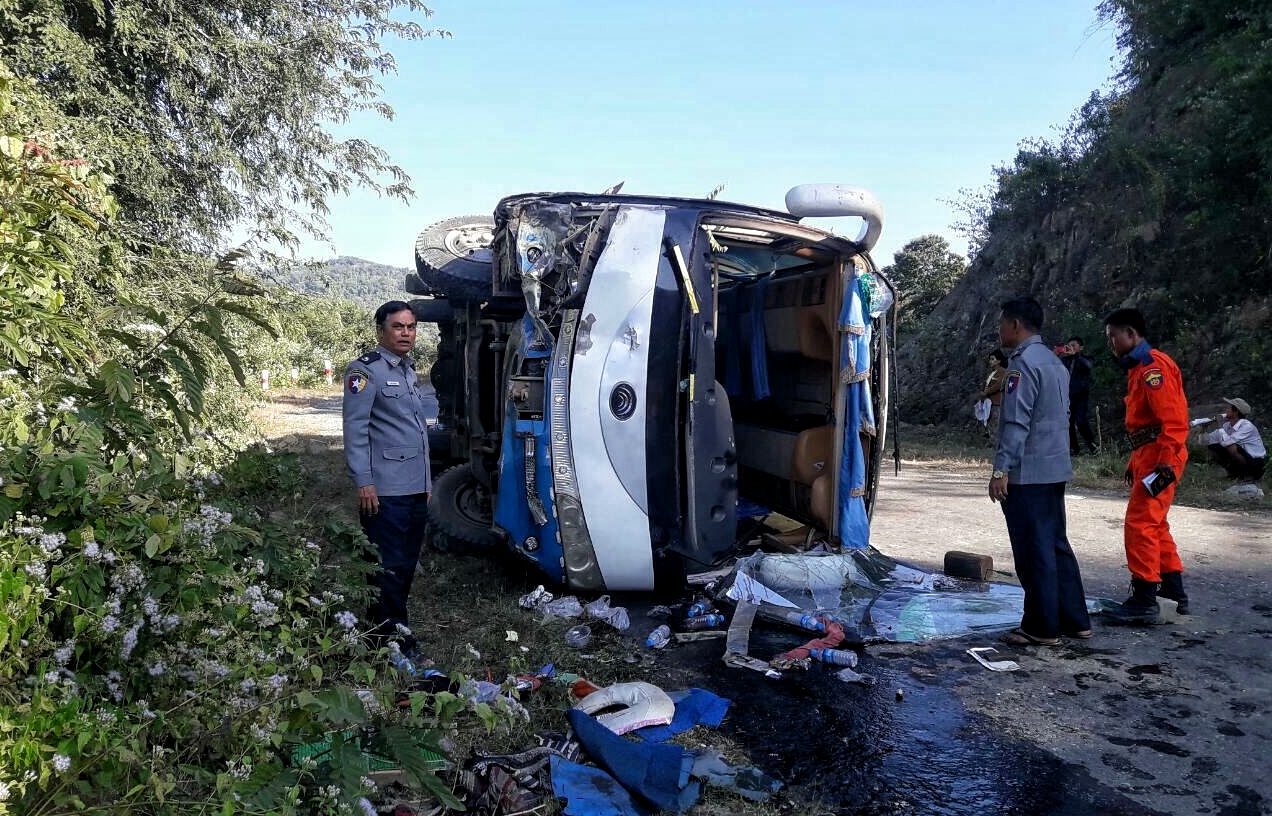 ဖြစ်စဉ်မှာ ယဉ်မောင်း ချစ်စန်းမောင် မောင်းနှင်လာသည့် ခြောက်ဘီးယာဉ်မှာ ဆော-ဆိပ်ဖြူကားလမ်း မိုင်တိုင်အမှတ် (၅၅/၁)နှင့် (၅၅/၂) မိုင်ကြားအရောက်တွင် ဘရိတ်ပေါက်၍ အရှိန်မထိန်းနိုင်ဘဲ တိမ်းမှောက်ခဲ့ပြီး ယာဉ်ပေါ်လိုက်ပါလာသူ ၁၉ ဦးအနက် ၄ ဦး ဒဏ်ရာရရှိခဲ့ခြင်း ဖြစ်သည်။