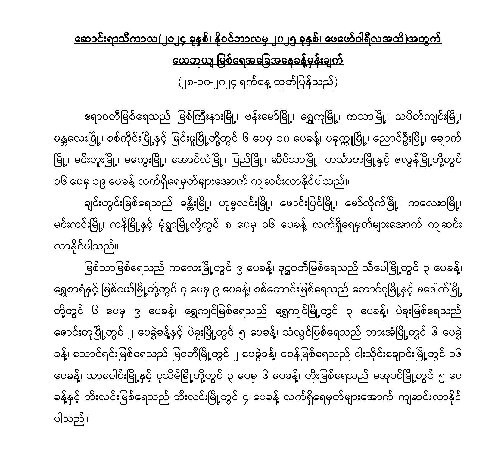 ဆောင်းရာသီကာလ (၂၀၂၄ ခုနှစ်၊ နိုဝင်ဘာလမှ ၂၀၂၅ ခုနှစ်၊ ဖေဖော်ဝါရီလအထိ) အတွက် ယေဘုယျမြစ်ရေအခြေအနေခန့်မှန်းချက်