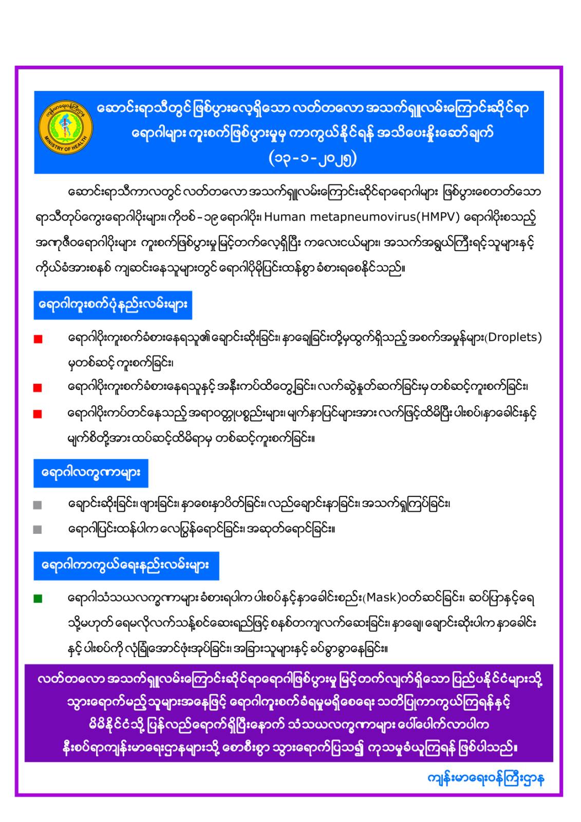 ဆောင်းရာသီတွင် ဖြစ်ပွားလေ့ရှိ လတ်တလော အသက်ရှူလမ်းကြောင်းဆိုင်ရာရောဂါများ ကူးစက်ဖြစ်ပွားမှုမှ ကာကွယ်နိုင်ရန် အသိပေးနှိုးဆော်ချက်