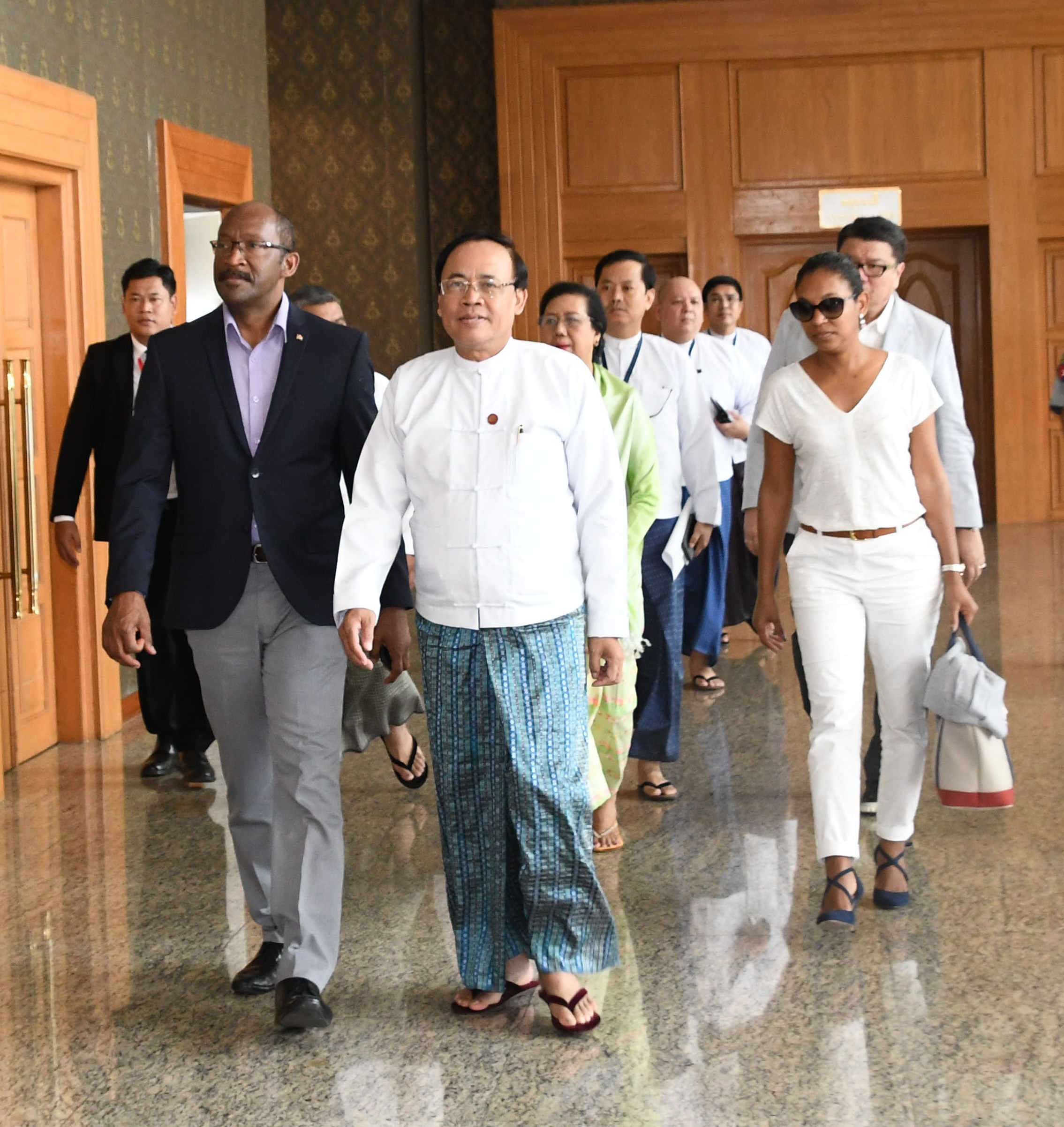 မြန်မာနိုင်ငံသို့ အလွတ်သဘောခရီးစဉ် ရောက်ရှိနေသော ဆေးရှဲလ်နိုင်ငံ ဒုတိယသမ္မတ H.E. Mr. Vincent Meriton နှင့်ဇနီး Mrs. Daniella Hoareau ဦးဆောင်သည့် အဖွဲ့သည် ယနေ့နံနက်ပိုင်းတွင် ရန်ကုန်မြို့မှ မြန်မာအမျိုးသားလေကြောင်းဖြင့် ထွက်ခွာရာ နေပြည်တော်သို့ မွန်းလွဲ ၁၂ နာရီခွဲတွင် ရောက်ရှိကြသည်။