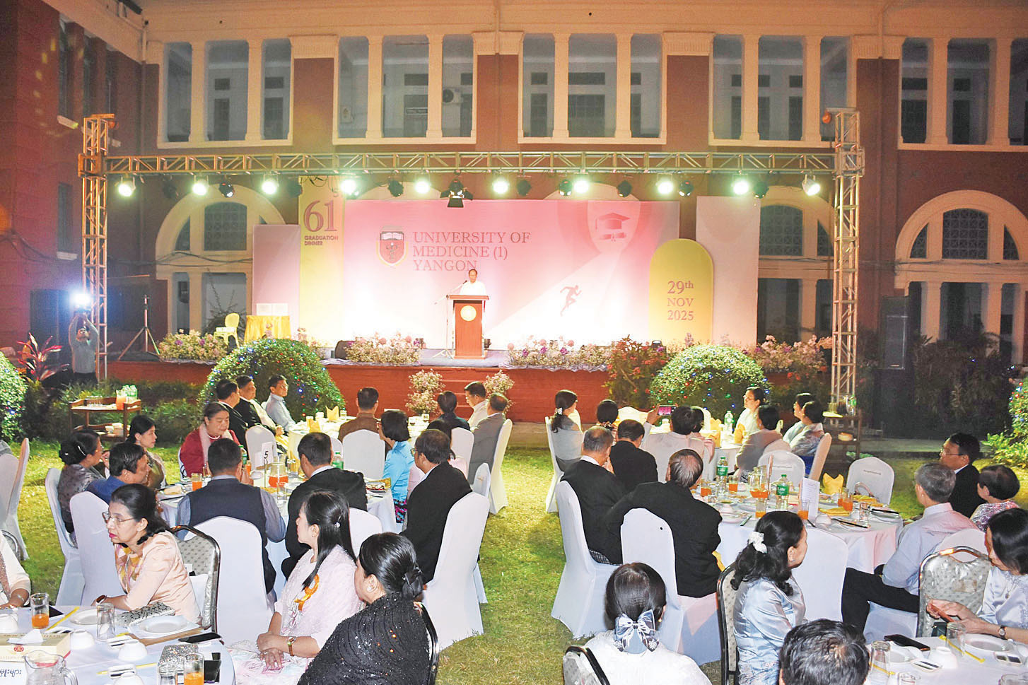 ကျန်းမာရေးဝန်ကြီးဌာန၊ ကျန်းမာရေးလူ့စွမ်းအားအရင်းအမြစ်ဦးစီးဌာန၊ ဆေးတက္ကသိုလ် (၁) ရန်ကုန် (၆၁) ကြိမ်မြောက် ဘွဲ့နှင်းသဘင်ဂုဏ်ပြုညစာစားပွဲအခမ်းအနားကို ယမန်နေ့ ညနေ ၆ နာရီက ဆေးတက္ကသိုလ် (၁) ရန်ကုန်လမ်းမတော်မြက်ခင်းပြင်၌ ကျင်းပသည်။