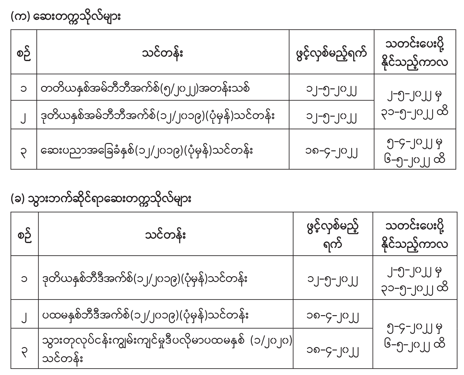 ကျန်းမာရေးဝန်ကြီးဌာနအောက်ရှိ ဆေးတက္ကသိုလ်များနှင့် ဆေးပညာနှီးနွှယ် တက္ကသိုလ်များ၌ အောက်ဖော်ပြပါ သင်တန်းများကို ယှဉ်တွဲဖော်ပြပါ နေ့ရက်များတွင် ဖွင့်လှစ်မည်ဖြစ်ပါ၍ သက်ဆိုင်ရာ တက္ကသိုလ်သို့ သတ်မှတ်ကာလအတွင်း သတင်းပေးပို့နိုင်ပါကြောင်းနှင့် အသေးစိတ်အချက်အလက်များ သိရှိလိုပါက သက်ဆိုင်ရာ တက္ကသိုလ်များ၏ Facebook Page, Website တို့တွင် ဝင်ရောက်ကြည့်ရှုခြင်း၊ တက္ကသိုလ်များသို့ တိုက်ရိုက်စုံစမ်း မေးမြန်းခြင်းများ ဆောင်ရွက်နိုင်ကြောင်း ကြေညာအပ်ပါသည်-