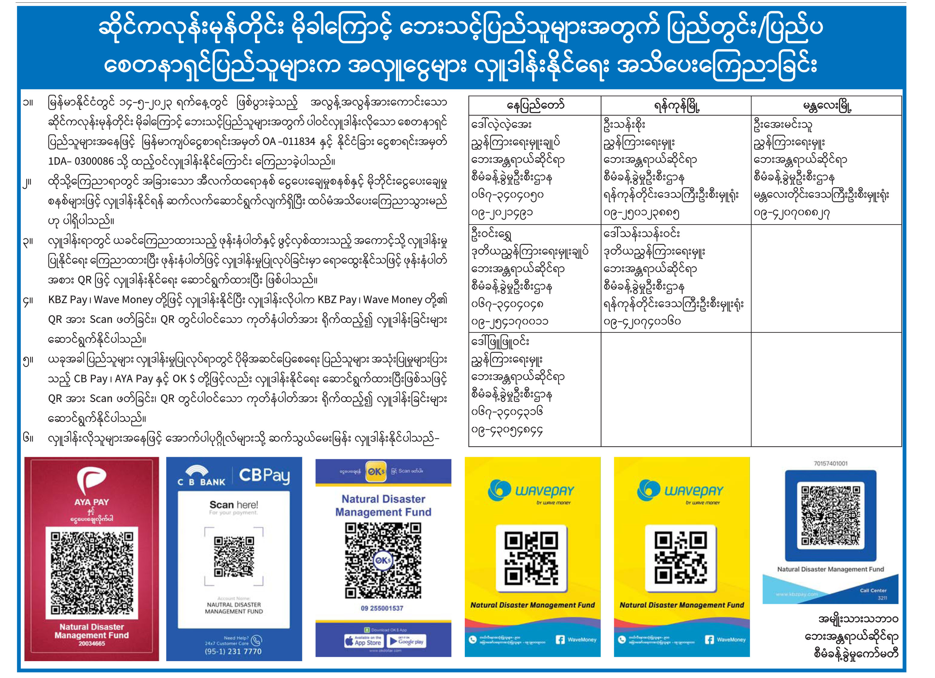 ဆိုင်ကလုန်းမုန်တိုင်း မိုခါကြောင့် ဘေးသင့်ပြည်သူများအတွက် ပြည်တွင်း/ပြည်ပ စေတနာရှင်ပြည်သူများက အလှူငွေများ လှူဒါန်းနိုင်ရေး အသိပေးကြေညာခြင်း