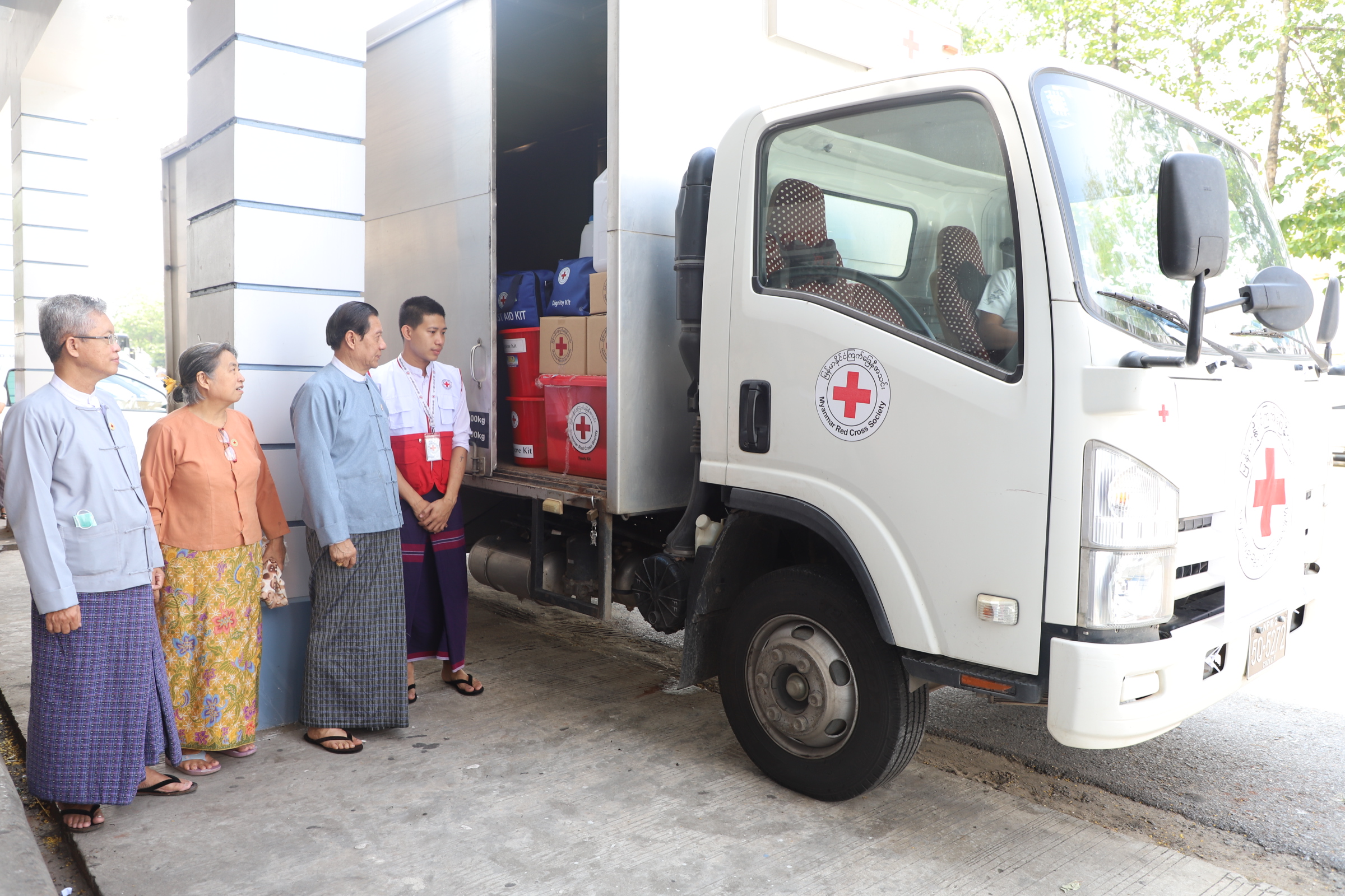အဆိုပါ ကူညီထောက်ပံ့ရေးပစ္စည်းများ တင်ပို့နိုင်ရန်အတွက် မြန်မာနိုင်ငံကြက်ခြေနီအသင်း ဥက္ကဋ္ဌ ပါမောက္ခ ဒေါက်တာ မျိုးညွန့်၊ ဒုတိယဥက္ကဋ္ဌ ဒေါက်တာဒေါ်တင်တင်လေးနှင့် အလုပ်အမှုဆောင်အဖွဲ့သည် ကယ်ဆယ်ရေးပစ္စည်းများ တင်ဆောင်နေမှုအခြေအနေနှင့် လိုအပ်ချက်များကို ကြည့်ရှုလမ်းညွှန်ပေးခဲ့သည်။