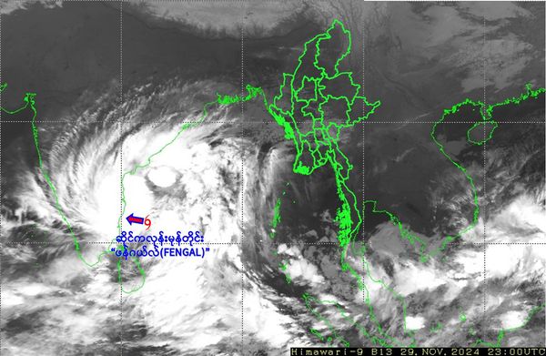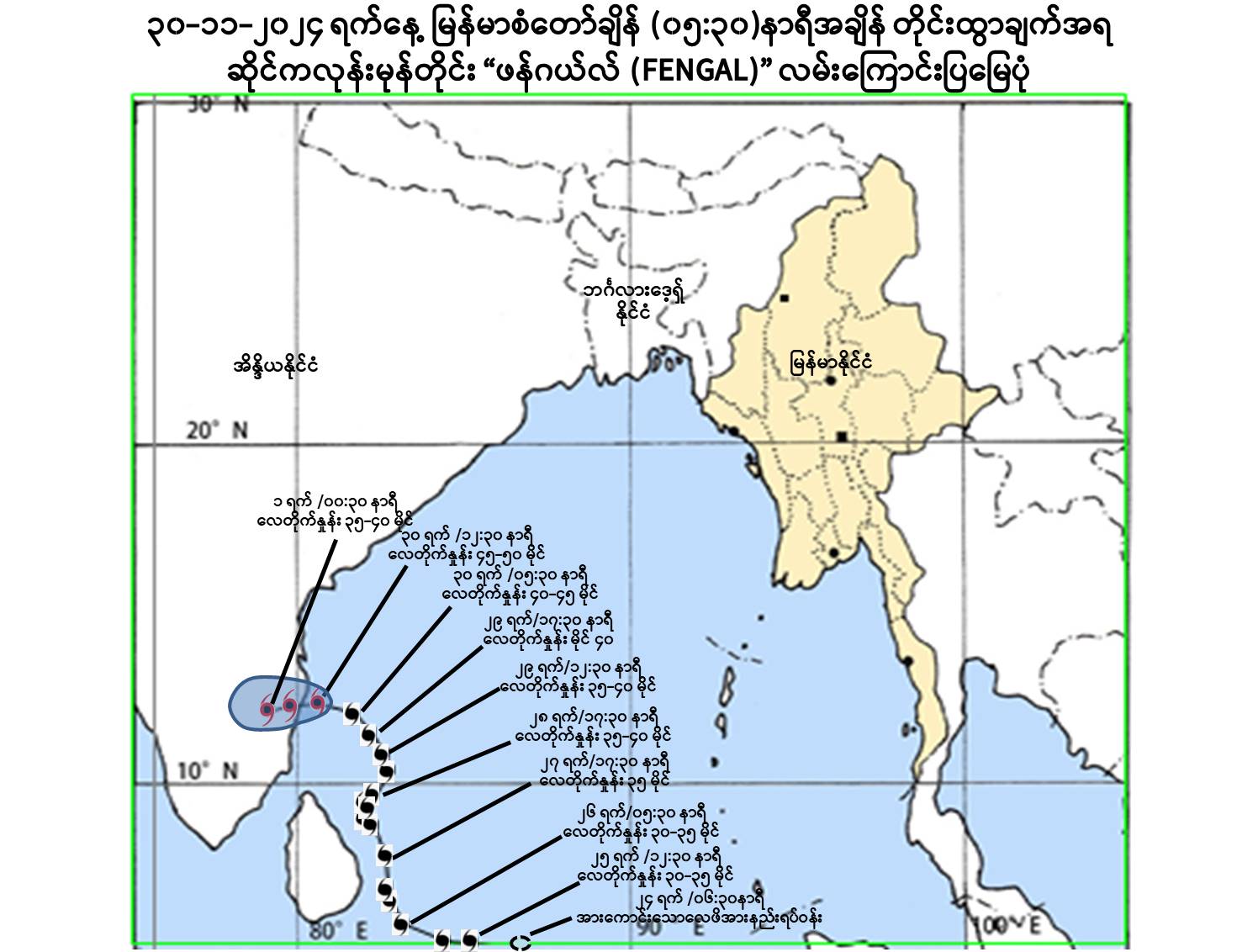 (၁) ယနေ့မြန်မာစံတော်ချိန် (၀၅:၃၀)နာရီအချိန် တိုင်းထွာချက်များအရ ဘင်္ဂလား ပင်လယ်အော် အနောက်တောင်ပိုင်းတွင် ဖြစ်ပေါ်နေသော ဆိုင်ကလုန်းမုန်တိုင်း “ဖန်ဂယ်လ်”(FENGAL)သည် မြောက်-အနောက်မြောက်ဘက်သို့ ရွေ့လျားခဲ့ပြီး၊ မြန်မာနိုင်ငံ၊ ကိုကိုးကျွန်းမြို့(Coco Island)၏ အနောက်-အနောက်တောင်ဘက် ရေမိုင် ၆၉၅ မိုင်ခန့်၊ အိန္ဒိယနိုင်ငံ၊ ချင်းနိုင်မြို့(Chennai)၏ အရှေ့တောင်ဘက် ရေမိုင် ၁၁၅ မိုင်ခန့်နှင့် ပူဒူချယ်ရီမြို့(Puducherry)၏ အရှေ့ဘက် ရေမိုင် ၁၁၀ မိုင်ခန့်အကွာ ပင်လယ်ပြင်ကို ဗဟိုပြုနေပါသည်။ ဗဟိုချက်လေဖိအား ၉၉၇ ဟက်တိုပါစကယ်နှင့် အမြင့်ဆုံးလေတိုက်နှုန်းမှာ တစ်နာရီလျှင် မိုင် ၄၀ မှ ၄၅ မိုင်နှုန်းခန့် ဖြစ်ပါသည်။