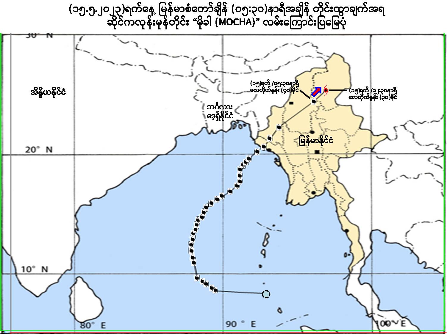 (၁) ယနေ့မြန်မာစံတော်ချိန် (၀၅:၃၀)နာရီအချိန် တိုင်းထွာချက်များအရ ချင်း ပြည်နယ်၊ မတူပီမြို့အနီးမှ ကုန်းတွင်းသို့ ရွေ့လျားဝင်ရောက်ခဲ့သော အားကောင်းသောဆိုင်ကလုန်းမုန်တိုင်း (Severe Cyclonic Storm) “မိုခါ” (MOCHA)သည် မြောက်-အရှေ့မြောက်ဘက်သို့ ရွေ့လျားခဲ့ပြီး၊ ဆိုင်ကလုန်း မုန်တိုင်း(Cyclonic Storm) “မိုခါ” (MOCHA)အဖြစ်သို့ အားလျော့သွားခဲ့ကာ စစ်ကိုင်းတိုင်းဒေသကြီးအထက်ပိုင်း၊ ကသာမြို့အနီးမှ မြောက်-အရှေ့ မြောက်ဘက်သို့ ဆက်လက်ရွေ့လျားလျက်ရှိပါသည်။