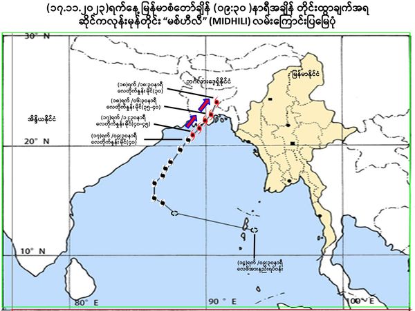 (၁) ယနေ့မြန်မာစံတော်ချိန် (၀၉:၃၀)နာရီအချိန် တိုင်းထွာချက်များအရ ဘင်္ဂလား ပင်လယ်အော်အနောက်မြောက်ပိုင်းတွင် ဖြစ်ပေါ်နေသော အားကောင်းသော မုန်တိုင်းငယ်(Deep Depression)သည် မြောက်-အရှေ့မြောက်ဘက်သို့ ရွေ့လျားခဲ့ပြီး၊ ပိုမိုအားကောင်းလာကာ ဆိုင်ကလုန်းမုန်တိုင်း(Cyclonic Storm) “မစ်ဟီလီ”(MIDHILI)အဖြစ်သို့ ရောက်ရှိခဲ့ပြီး၊ မြန်မာနိုင်ငံ၊ စစ်တွေမြို့(Sittwe) ၏ အနောက်ဘက် ရေမိုင် (၂၃၅)မိုင်ခန့်၊ မောင်တောမြို့(Maungdaw)၏ အနောက်-အနောက်တောင်ဘက် ရေမိုင် (၂၁၀)မိုင်ခန့်၊ အိန္ဒိယနိုင်ငံ၊ ပါရာဒစ် မြို့(Paradip)၏ အရှေ့ဘက် ရေမိုင် (၁၂၀)မိုင်ခန့်၊ ဒီဂါမြို့(Digha)၏ တောင်-အရှေ့တောင်ဘက် ရေမိုင် (၁၀၅)မိုင်ခန့်နှင့် ဘင်္ဂလားဒေ့ရှ်နိုင်ငံ၊ ခီပူပါရာမြို့ (Khepupara)၏ အနောက်တောင်ဘက် ရေမိုင် (၁၃၀)မိုင်ခန့်အကွာ ပင်လယ်ပြင် ကို ဗဟိုပြုနေပါသည်။