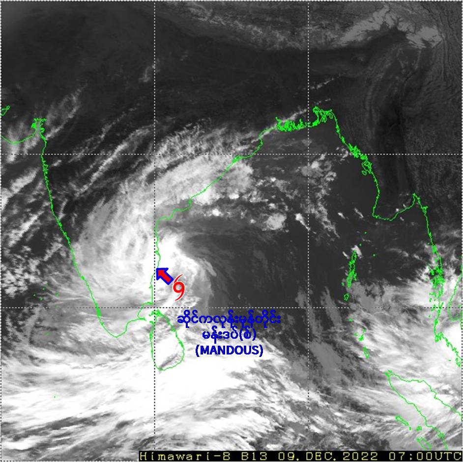 (၁) ယနေ့မြန်မာစံတော်ချိန် (၁၃:၃၀)နာရီအချိန် တိုင်းထွာချက်များအရ ဘင်္ဂလားပင်လယ်အော်အနောက်တောင်ပိုင်းတွင် ဖြစ်ပေါ်နေသောအားကောင်းသောဆိုင်ကလုန်းမုန်တိုင်း(Severe Cyclonic Storm)“မန်းဒပ်(စ်) (MANDOUS)”သည် အနောက်-အနောက်မြောက်ဘက်သို့ ရွေ့လျားခဲ့ပြီး၊ဘင်္ဂလားပင်လယ်အော်အနောက်တောင်ပိုင်း(အိန္ဒိယနိုင်ငံ၊ တမီးလ်နာဒူးမြောက်ပိုင်းကမ်းလွန် -ပူဒူချယ်ရီကမ်းခြေ)တွင် ဆိုင်ကလုန်းမုန်တိုင်း(Cyclonic Storm) “မန်းဒပ်(စ်) (MANDOUS)”အဖြစ်သို့ အားလျော့သွားခဲ့ကာ၊ မြန်မာနိုင်ငံ၊ ကိုကိုးကျွန်းမြို့(CocoIsland)၏ အနောက်-အနောက်တောင်ဘက် ရေမိုင်(၇၃၀)မိုင်ခန့်၊ ဟိုင်းကြီးကျွန်းမြို့(Hainggyikyun)၏ အနောက်-အနောက်တောင်ဘက် ရေမိုင်(၈၁၅)မိုင်ခန့်၊သီရိလင်္ကာနိုင်ငံ၊ ဂျက်ဖ်နာမြို့(Jaffna)၏ အရှေ့မြောက်ဘက်ရေမိုင်(၁၁၅)မိုင်ခန့်နှင့် အိန္ဒိယနိုင်ငံ၊ချင်းနိုင်မြို့(Chennai)၏ တောင်-အရှေ့တောင်ဘက် ရေမိုင်(၁၂၅)မိုင်ခန့်အကွာပင်လယ်ပြင်ကို ဗဟိုပြုနေပါသည်။