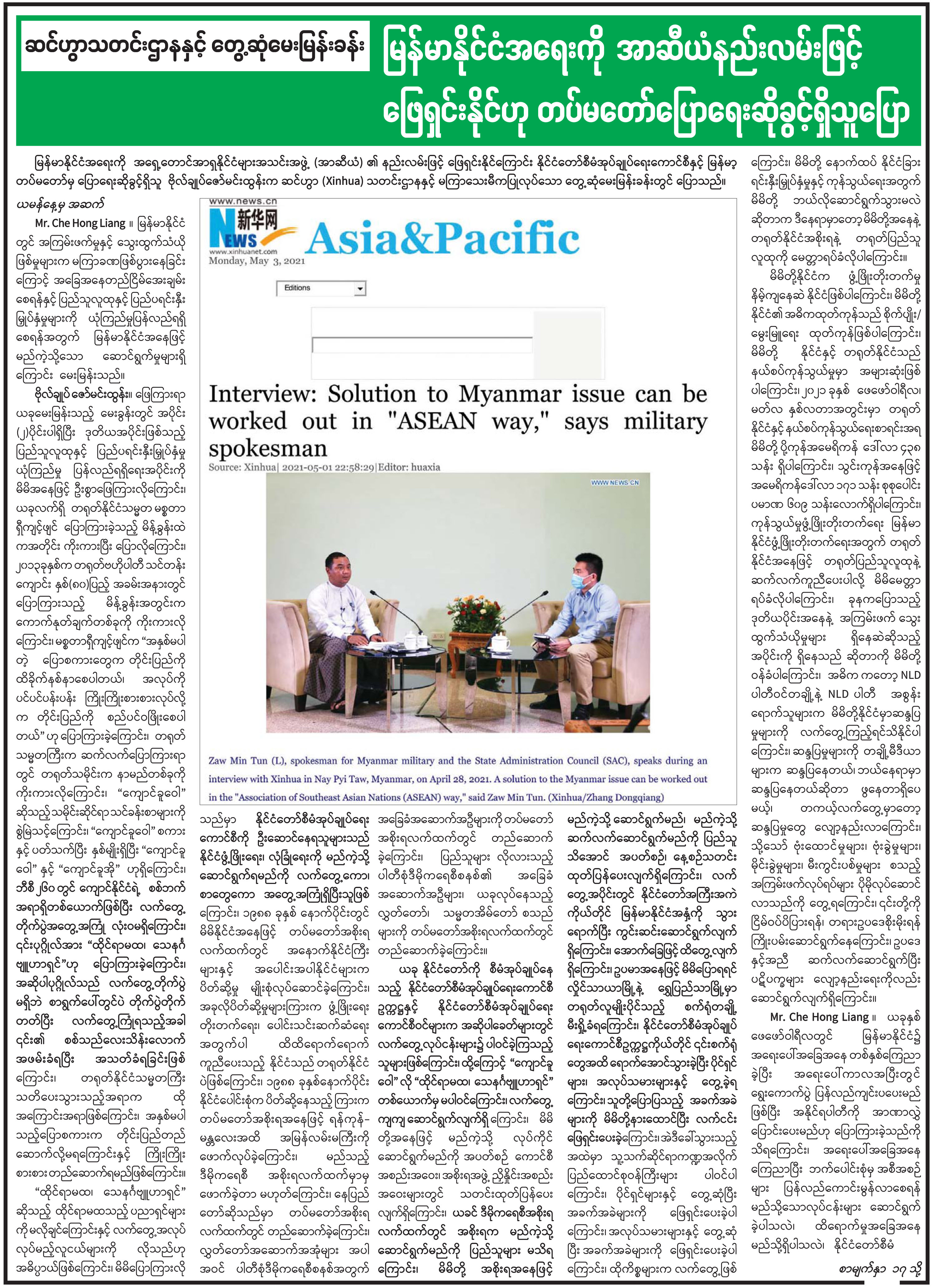 ဆင်ဟွာသတင်းဌာနနှင့် တွေ့ဆုံမေးမြန်းခြင်း မြန်မာနိုင်ငံအရေးကို အာဆီယံနည်းလမ်းဖြင့် ဖြေရှင်းနိုင်ဟု တပ်မတော်ပြောရေးဆိုခွင့်ရှိသူပြော