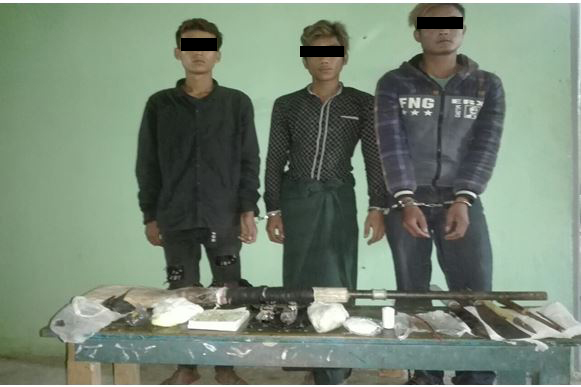 ၎င်းတို့သုံးဦးနှင့်အတူ ပြောင်းဝ(၁)လက်မ၊ လုံးပတ်(၃)လက်မ၊ ပြောင်းအရှည် (၃၆) လက်မ၊ သစ်သားဒင်(၂၈) လက်မ၊ အပါ်ကျည်ရိုက်မီးပါ တူမီးလုပ်သေနတ်(၁)လက်၊ အရိုးအသွား (၁၅)လက်မခွဲခန့် ဓါးတစ်ချောင်း၊ အရိုးအသွား(၁၇)လက်မခွဲခန့် ဆင်ဦးစီးဓါးတစ်ချောင်း၊ အရိုးအသွား(၁၆)လက်မခန့် သစ်သားရိုးတပ် မြားတစ်ချောင်း၊ ကျွတ်စ(၁)ထုတ်၊ ယမ်းအနက်ရောင်အမှုန့်(၁)ထုတ်၊ အဝါရောင်ကန့်မှုန့်(၁)ထုတ်၊ အဖြူရောင် ယမ်းရမ်း စိမ်းမှုန့် (၁)ထုတ်၊ “အမ်ကုန်းကြီး km တံဆိပ်ပါ ယမ်းခွေ(၁)ဗူး၊ အဆပ်ထည့်ထားသော ပင်နယ်စလင် ပုလင်း(၄)လုံး၊ လဲ(၁)ထုတ်၊ ဂွမ်း(၁)ထုတ်၊ ၂လက်မခွဲသံ(၅) ချောင်းနှင့်အဖြူရောင်အပ် ချည်လုံး (၁)လုံး၊ Olyoic တံဆိပ်ပါ အဖြူရောင် ကြွပ်ကြွပ်အိတ်ကြီး တစ်လုံးတို့ကို သက်သေခံ ပစ္စည်းများအဖြစ် ဖမ်းဆီးရမိခဲ့ခြင်း ဖြစ်သည်။