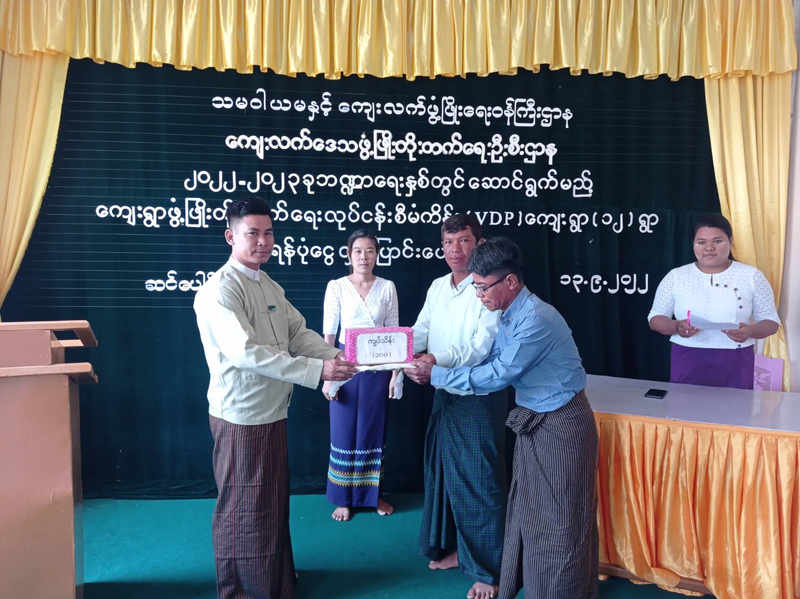 ထို့နောက် ရန်ပုံငွေများအား သက်ဆိုင်ရာတာဝန်ရှိသူများမှ ထောက်ပံ့ပေးအပ်ခဲ့ရာ ဒေသဖွံ့ဖြိုးရေး လုပ်ငန်းများ ဆောင်ရွက်မည့် ရွာသစ်ကျေးရွာ၊ စည်ပင်လှကျေးရွာ၊ ဝါးရှိ (ကုန်း) ကျေးရွာ၊ တဲချောင်းကျေးရွာ၊ ကန်လှကျေးရွာ၊ မကြီးကန်ကျေးရွာ၊ ဆိုင်းစုကျေးရွာ၊ အလယ်ရွာ​​ကျေးရွာ၊ မောင်းတုန်းကျေးရွာ၊ နားပဲ့ကျေးရွာ၊ သာဝတ္တိကျေးရွာ၊ ကရကတ်ကျေးရွာများမှ တာဝန်ရှိသူများက လက်ခံရယူခဲ့ကြောင်း သိရှိရသည်။