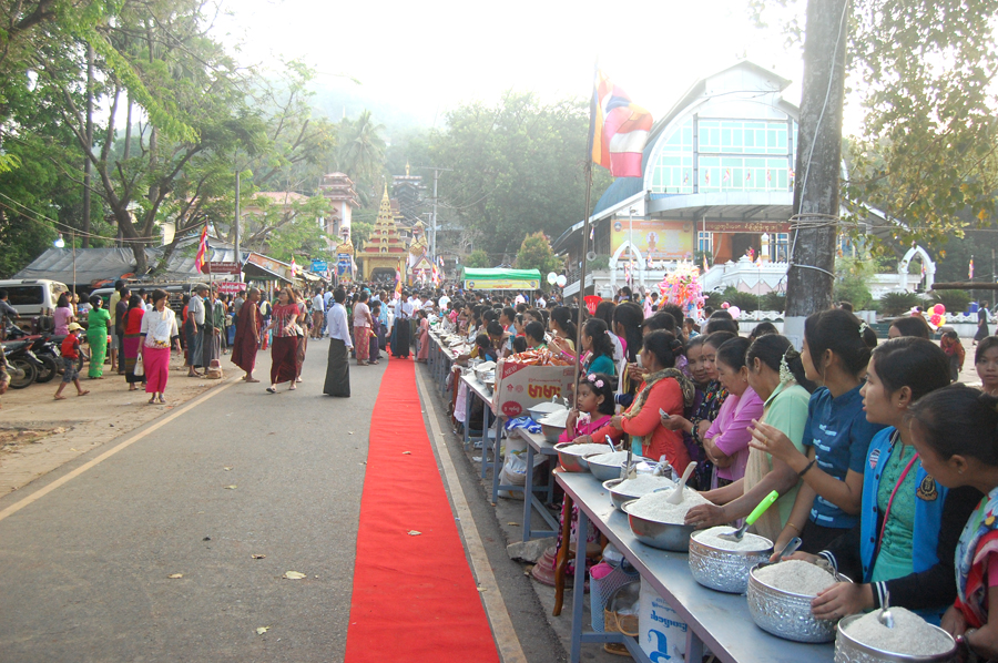 ယနေ့နံနက် ၅ နာရီတွင် သံဃာတော် ၄၅ ပါးတို့က တောင်ထိပ်ရှိ ဆံတော်ရှင် စေတီတော်မြတ်ကြီးအား ဗုဒ္ဓါဘိသေက အနေကဇာတင် ပူဇော်ကာ ပန်း၊ ဆီမီး၊ အမွှေးနံ့သာများနှင့် ဆွမ်းပွဲ တစ်ထောင်ဖြင့် ကပ်လှူပူဇော်ကြပြီး နံနက် ၇ နာရီမှစတင်ကာ သထုံမြို့နယ် အတွင်းရှိ ကျောင်းတိုက်ပေါင်း ၁၇၄ ကျောင်းမှ သံဃာတော် ၆၅၀ ကျော်နှင့် သီလရှင်ကျောင်းတိုက် ၃၆ တိုက်မှ သီလရှင် ၈၀ ကျော်တို့အား အလှူရှင်အသီးသီးတို့က ရာဟု(ထမနဲ)၊ ဆွမ်းဆန်နှင့် လှူဖွယ်ဝတ္ထု အသီးသီးတို့ကို တောင်ခြေတွင် စုပေါင်းလောင်းလှူခဲ့ကြသည်။