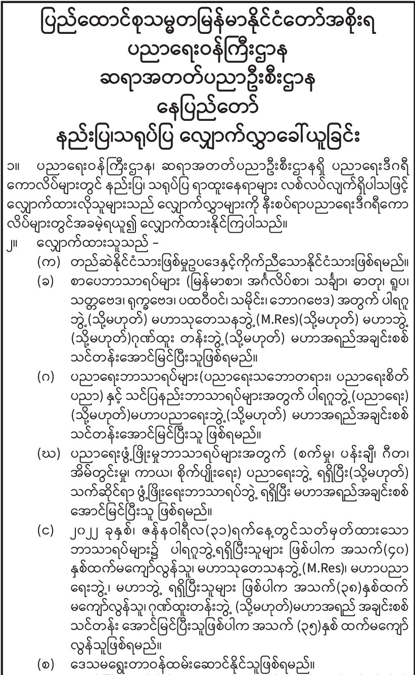 ဆရာအတတ်ပညာ ဦးစီးဌာန နေပြည်တော် နည်းပြ၊ သရုပ်ပြ လျှောက်လွှာခေါ်ယူ