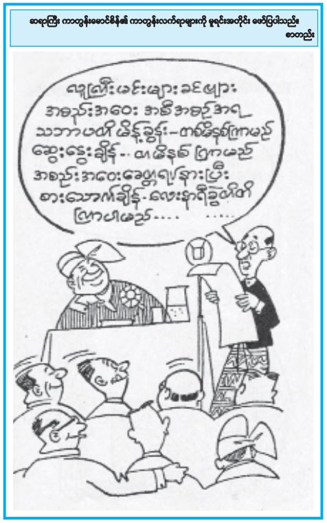 ဆရာကြီး ကာတွန်းမောင်စိန်၏ ကာတွန်းလက်ရာများကို မူရင်းအတိုင်း ဖော်ပြပါသည်။