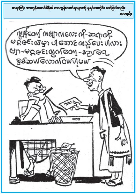 ဆရာကြီး ကာတွန်းမောင်စိန်၏ ကာတွန်းလက်ရာများကို မူရင်းအတိုင်း ဖော်ပြပါသည်။