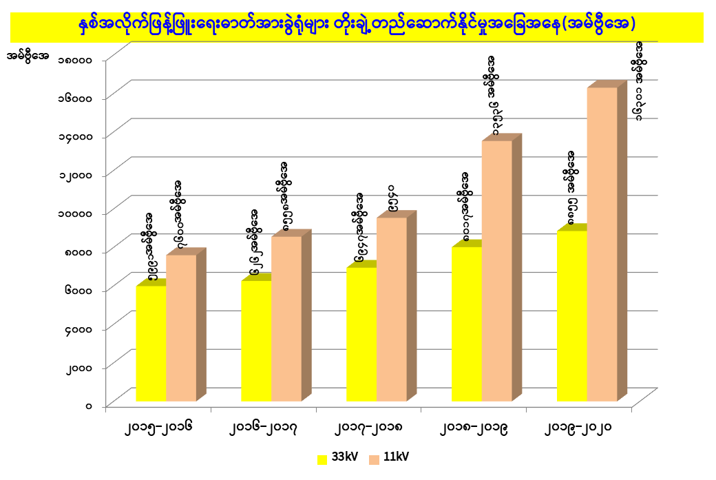 ယခု ၂၀၂၀ ပြည့်နှစ်တွင် ဓာတ်အားထုတ်လုပ်မှု၌ နိုင်ငံတစ်ဝန်း စက်ရုံအားလုံးက 3824MW အထိ တိုးမြှင့် ထုတ်လုပ်ပေးခဲ့ရပြီး ယင်းပမာဏ၏ တစ်ဝက်နီးပါးမျှကို ရန်ကုန်ဒေသက သုံးစွဲနေခြင်းဖြစ်ကြောင်းလည်း လျှပ်စစ်နှင့်စွမ်းအင်ဝန်ကြီးဌာန၏ ထုတ်ပြန်ချက်များအရ သိရှိရသည်။ ဓာတ်အားဖြန့်ဖြူးရေးအပိုင်းတွင်လည်း မြို့ပြ၊ ရပ်ရွာ၊ လူနေဒေသများသို့ လျှပ်စစ်ဓာတ်အားကို အရည်အသွေးပြည့်ပြည့်နှင့် မပြတ်မတောက် တည်ငြိမ် စွာ ဓာတ်အားပေးနိုင်ရန် ဓာတ်အားဖြန့်ဖြူးဓာတ်အားလိုင်းများ ကြံ့ခိုင်ကောင်းမွန်ရေးသည် အလွန်အရေးကြီး သည်။ 66 kV၊ 33 kV၊ 11 kV၊ 6.6 kV၊ 400V စသည့် ဓာတ်အားလိုင်းများဖြင့် လူနေဒေသတွင်းသို့ ဓာတ်အားဖြန့်ဖြူးခြင်းဖြစ်သည့်အတွက် သတ်မှတ်စံချိန်စံညွှန်း ပြည့်ဝပြီး အန္တရာယ်ကင်းရှင်းစွာ ဖြန့်ဖြူးနိုင်သည့် အရည်အသွေးများရှိရန် လိုအပ်ပါသည်။ သစ်ပင်သစ်ကိုင်း၊ အဆောက်အအုံများဖြင့် ကင်းလွတ်ကာ ဥတုသုံးပါးစလုံး ကောင်းမွန်စွာ ဓာတ်အားဖြန့်ဖြူးနိုင်သော ဓာတ်အားလိုင်းများဖြစ်ရန် အရေးကြီးပါသည်။ ထို့အတူ ဓာတ်အားဖြန့်ဖြူး ထရန်စဖော်မာများသည်လည်း အကာအကွယ်စနစ် အပြည့်အစုံဖြင့် လူနေရပ်ကွက်များအတွင်း အန္တရာယ်ကင်းရှင်းသည့်အခြေအနေဖြင့် တည်ဆောက် ဖြန့်ဖြူးရန်လိုအပ်ပါသည်။ သို့မှသာ အန္တရာယ်ကင်းရှင်းပြီး တည်ငြိမ်စွာဖြင့် စဉ်ဆက်မပြတ်ဓာတ်အားဖြန့်ဖြူးနိုင်မည်ဖြစ်ပါသည်။