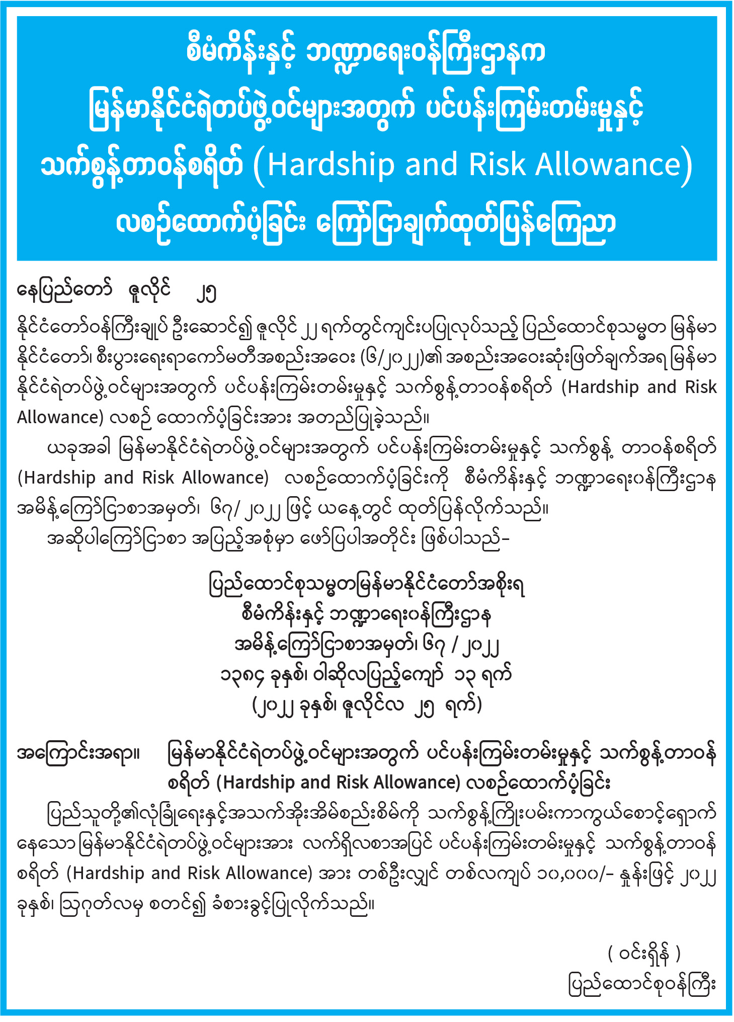 စီမံကိန်းနှင့် ဘဏ္ဍာရေးဝန်ကြီးဌာနက မြန်မာနိုင်ငံရဲတပ်ဖွဲ့ဝင်များအတွက် ပင်ပန်းကြမ်းတမ်းမှုနှင့် သက်စွန့်တာဝန်စရိတ် (Hardship and Risk Allowance) လစဉ်ထောက်ပံ့ခြင်း ကြော်ငြာချက် ထုတ်ပြန်ကြေညာ