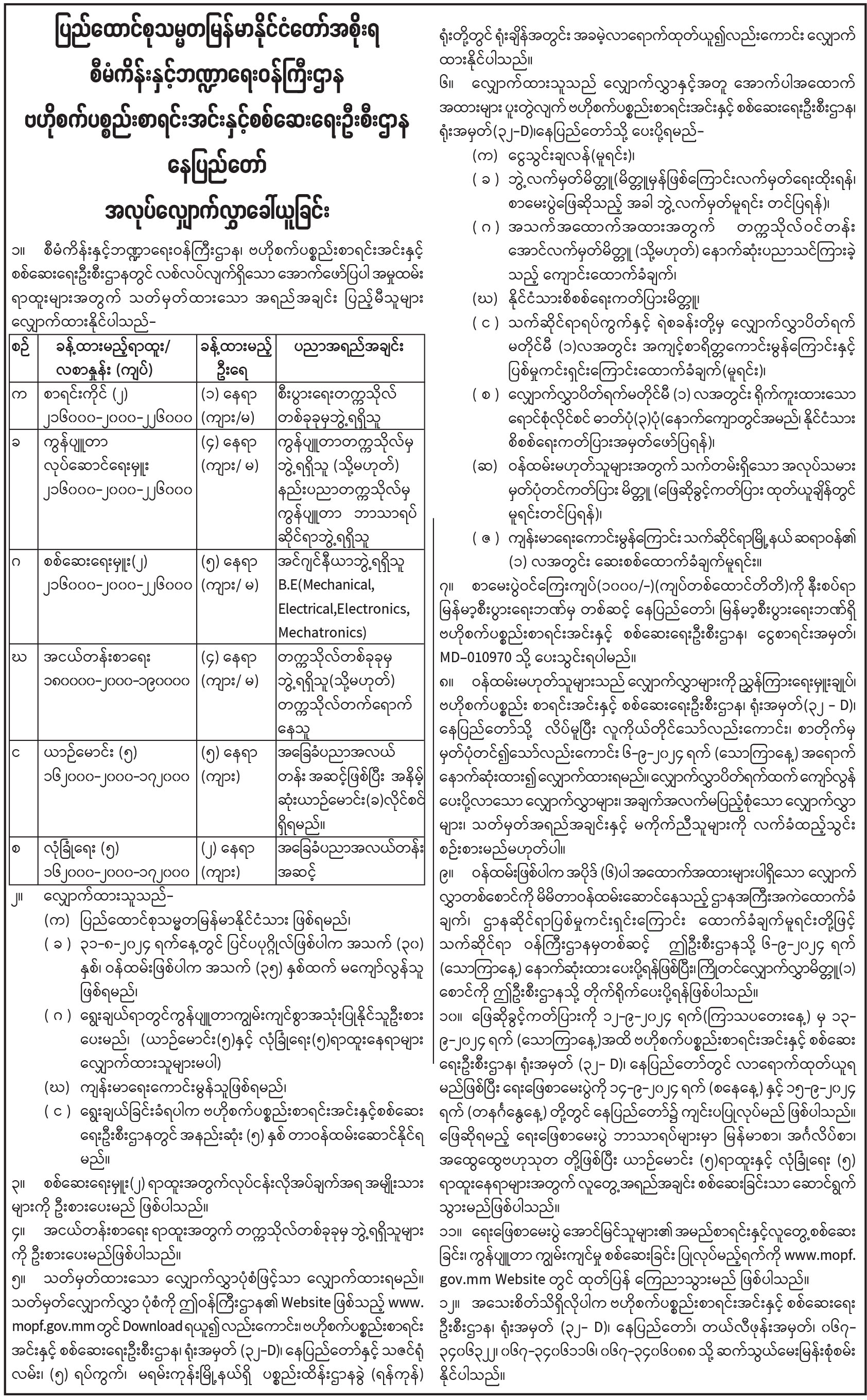 စီမံကိန်းနှင့်ဘဏ္ဍာရေးဝန်ကြီးဌာန၊ ဗဟိုစက်ပစ္စည်းစာရင်းအင်းနှင့် စစ်ဆေးရေးဦးစီးဌာန၊ နေပြည်တော် အလုပ်လျှောက်လွှာခေါ်