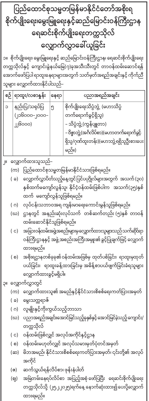 စိုက်ပျိုးရေး၊ မွေးမြူရေးနှင့် ဆည်မြောင်းဝန်ကြီးဌာန၊ ရေဆင်းစိုက်ပျိုးရေးတက္ကသိုလ်နှင့် ကျောင်းခွဲနယ်မြေ(၇)ခုအသီးသီးတွင် တာဝန်ထမ်းဆောင်ရန် သတ်မှတ်အရည်အချင်းနှင့် ကိုက်ညီ သူများ လျှောက်ထားနိုင်