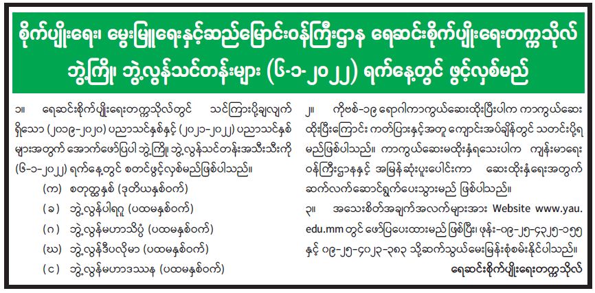 စိုက်ပျိုးရေး၊ မွေးမြူရေးနှင့်ဆည်မြောင်းဝန်ကြီးဌာန ရေဆင်းစိုက်ပျိုးရေးတက္ကသိုလ် ဘွဲ့ကြို၊ ဘွဲ့လွန်သင်တန်းများ (၆-၁-၂၀၂၂) ရက်နေ့တွင် ဖွင့်လှစ်မည်